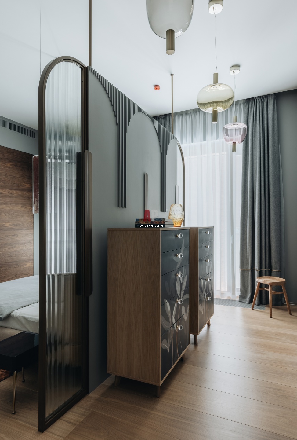 Спальня оформлена в комфортной серой гамме. Между входом и спальным местом установлена легкая перегородка со стеклянными элементами. Комоды, The Idea.