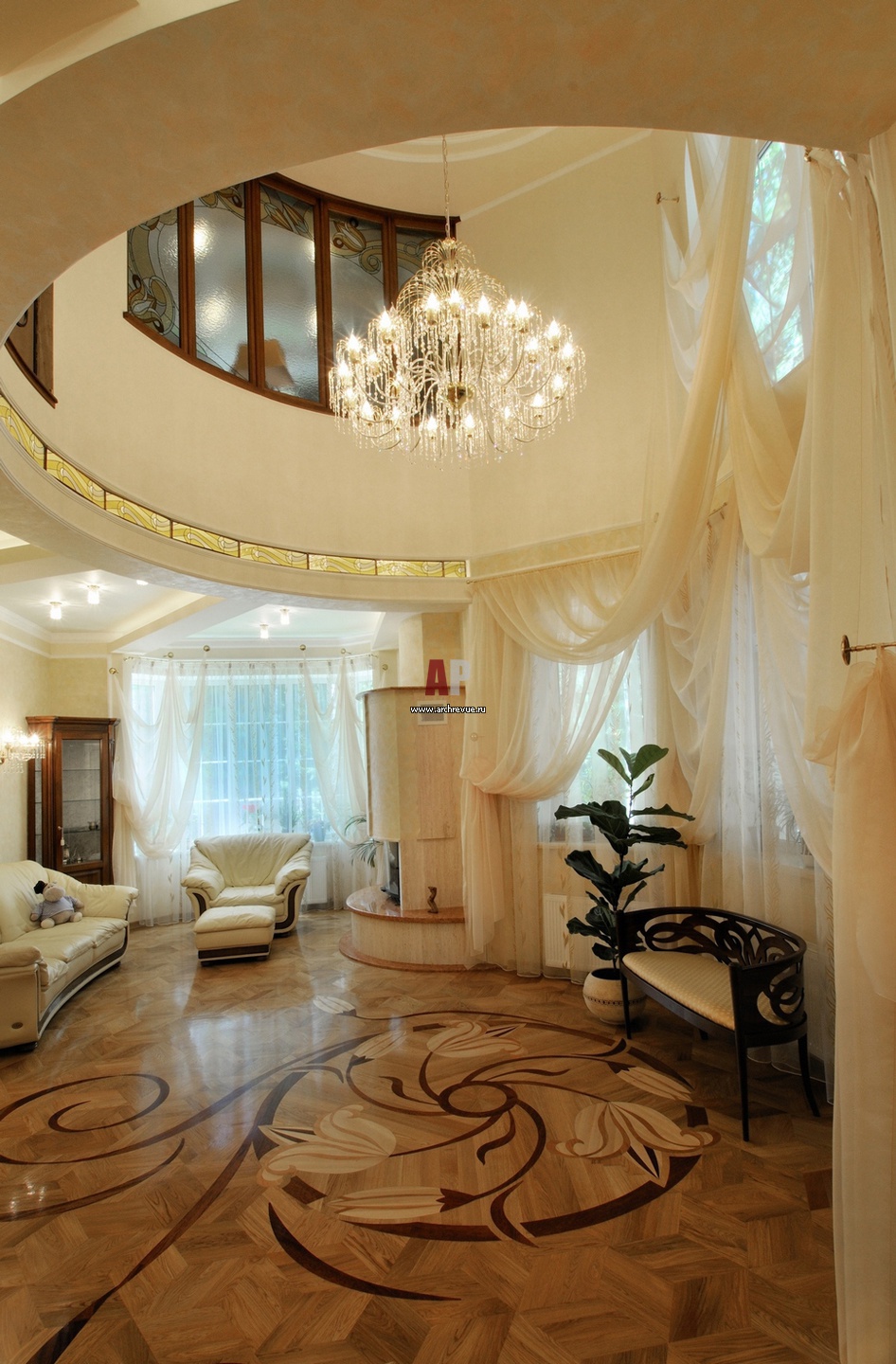 Декоративным акцентом гостиной становятся изображения лилий на полу, который выложен дубовым паркетом, поставщик «СМквадрат»
