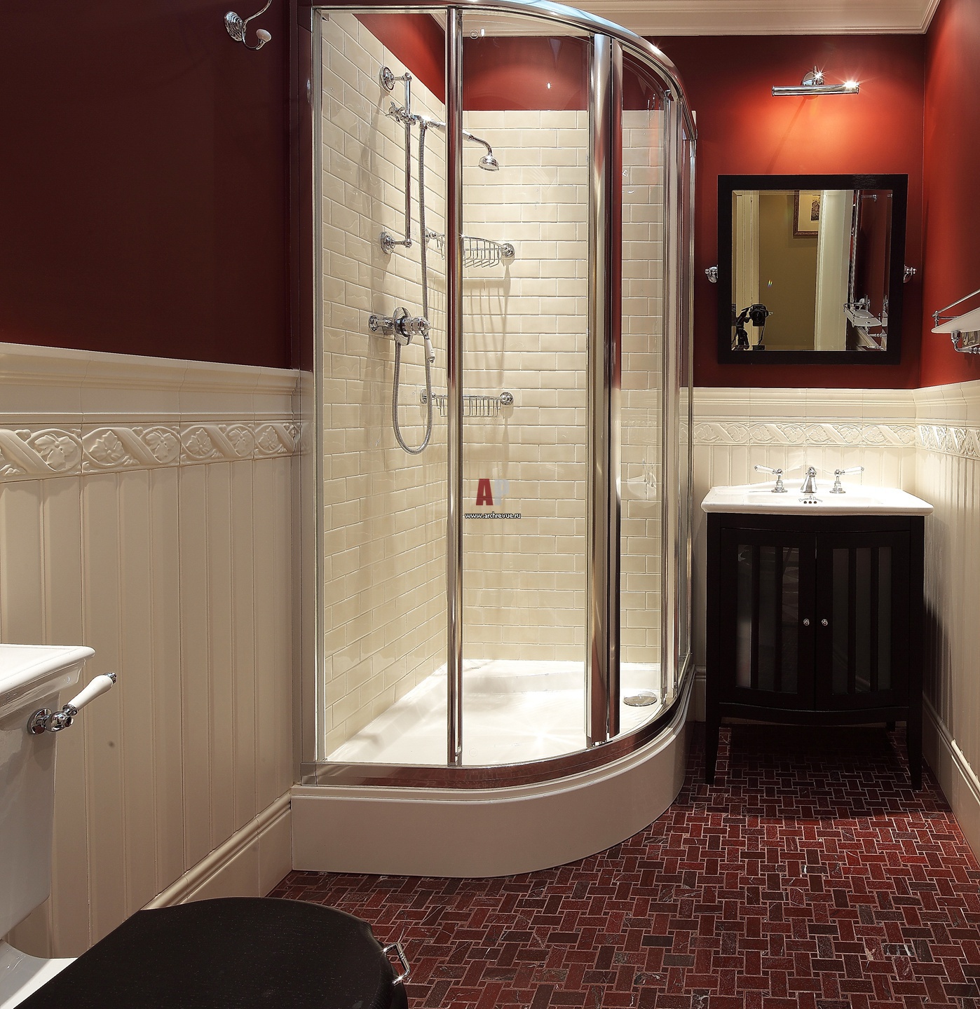 Стены гостевого санузла облицованы керамической плиткой, имитирующей буазери, и покрашены в темно-бордовый цвет. На полу - мраморная мозаика Sicis также бордового цвета.