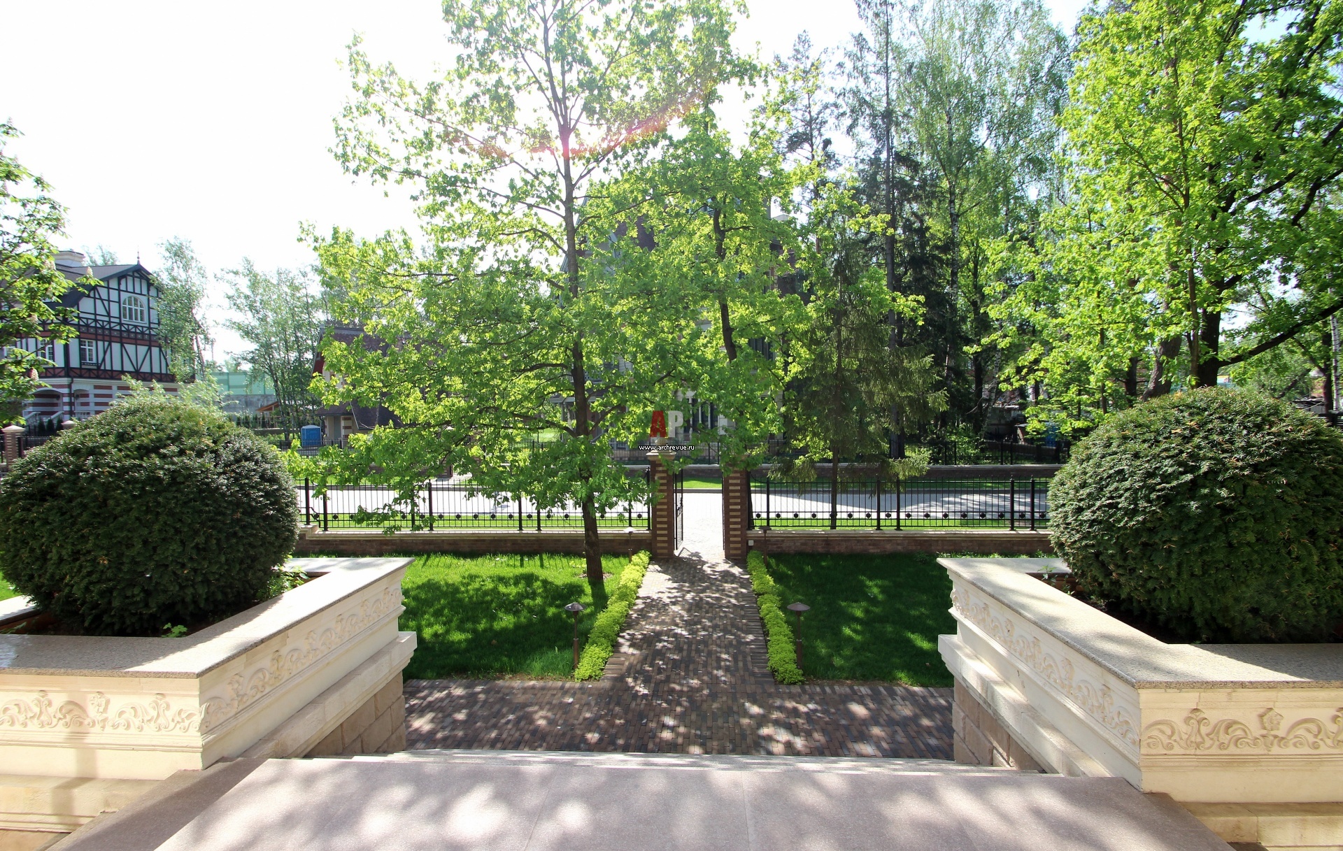 В вазонах при входе в дом высажены шары из тиса. Зимой они оформляются специально сделанными под размер чехлами и укрываются еловым лапником. Хозяева дополнительно декорируют их гирляндами, превращая в рождественские арт-объекты.