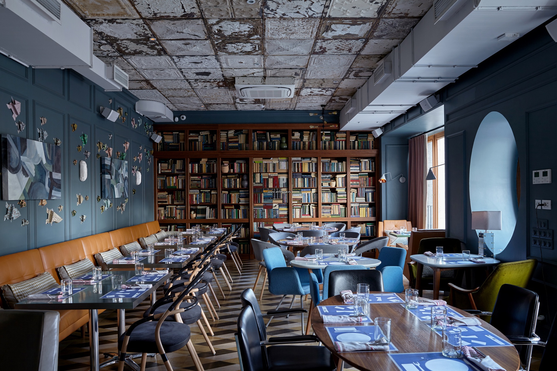 Банкетный зал с кожаными креслами и диванами, зелеными панелями на стенах, гипсовыми молдингами, библиотекой, потолком из металлических панелей и мраморными столами похож на нью-йоркский интеллектуальный клуб или лобби отеля с винтажной обстановкой. Диваны, столы с мраморными столешницами в духе 1950-х сделаны по авторским эскизам.