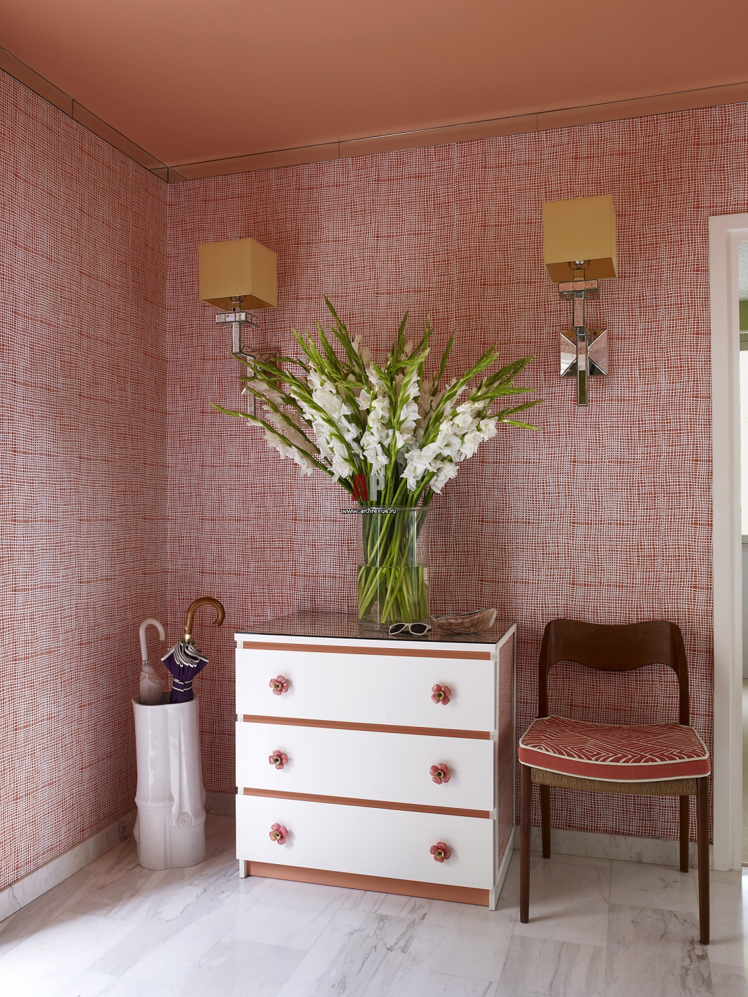 Фото интерьера прихожей в квартире для отдыха на берегу моря. Стены и комод оклеены обоями ручной печати в стиле 1970-х годов. Зеркальный карниз визуально увеличивает высоту помещения.
