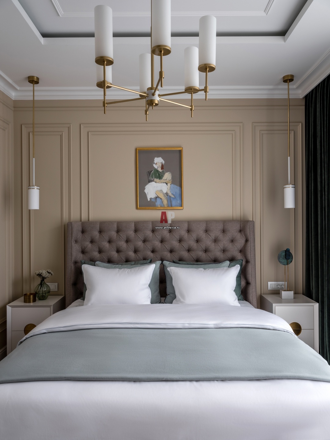 Хозяйская спальня оформлена в карамельно-бежевых тонах. Кровать, Dantone Home. Картина над изголовьем кровати работы Алены Раковой.