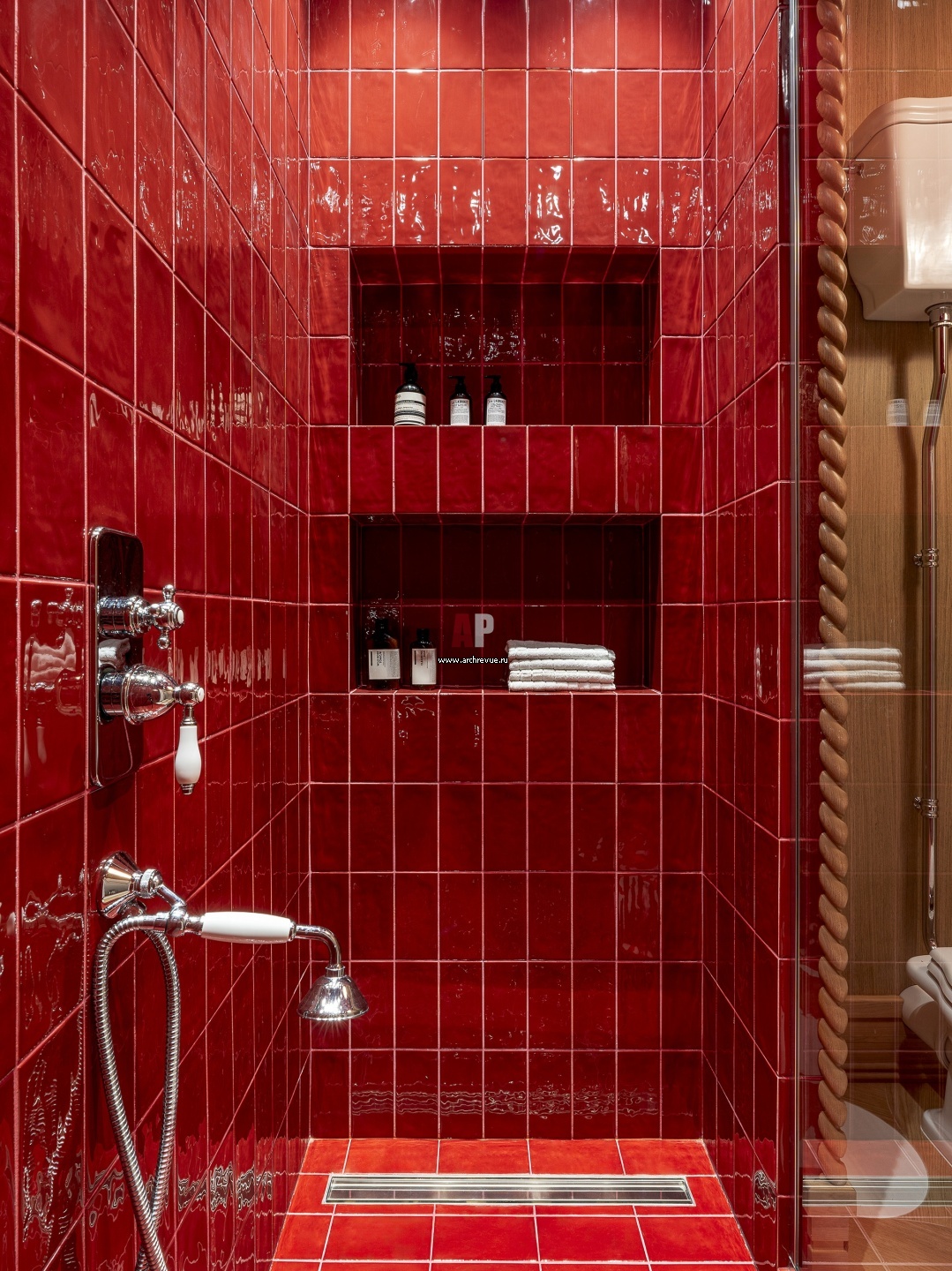 Красный санузел. Душевая. На стене – плитка, Tonalite. Смесители, Fima Carlo Frattini.