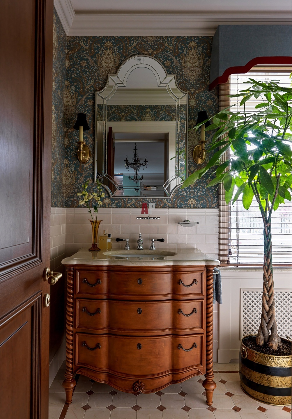 Гостевой санузел выполнен в английском стиле. Сантехника, Devon & Devon.