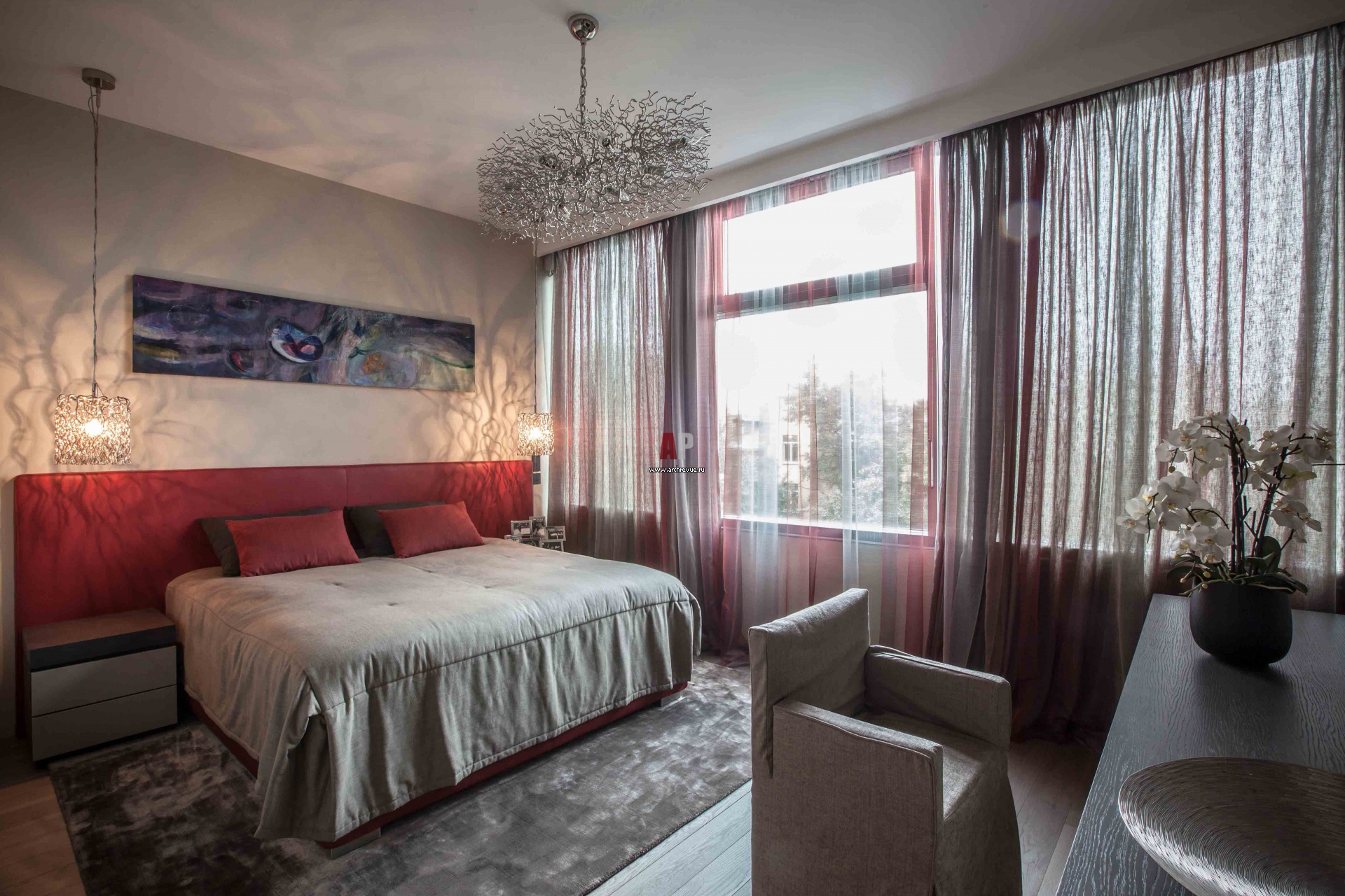 Интерьер гостевой спальни с красными акцентами. Они дублируются в отделке общих для всех помещений квартиры серо-жемчужных панелей-буазери Laura Meroni.