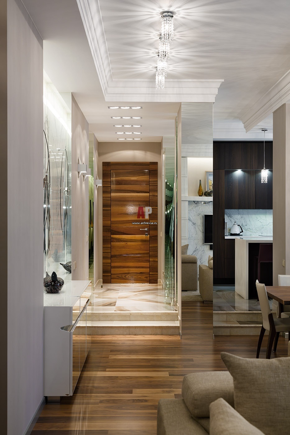 Фото интерьера входной группы в общем пространстве гостиной. Прихожая обозначена с помощью подиума со ступенями. Яркий акцент спокойной по настроению квартиры – межкомнатные двери Bellissimo по дизайну Роберто Страччиа с широкими наличниками из шпона ореха.