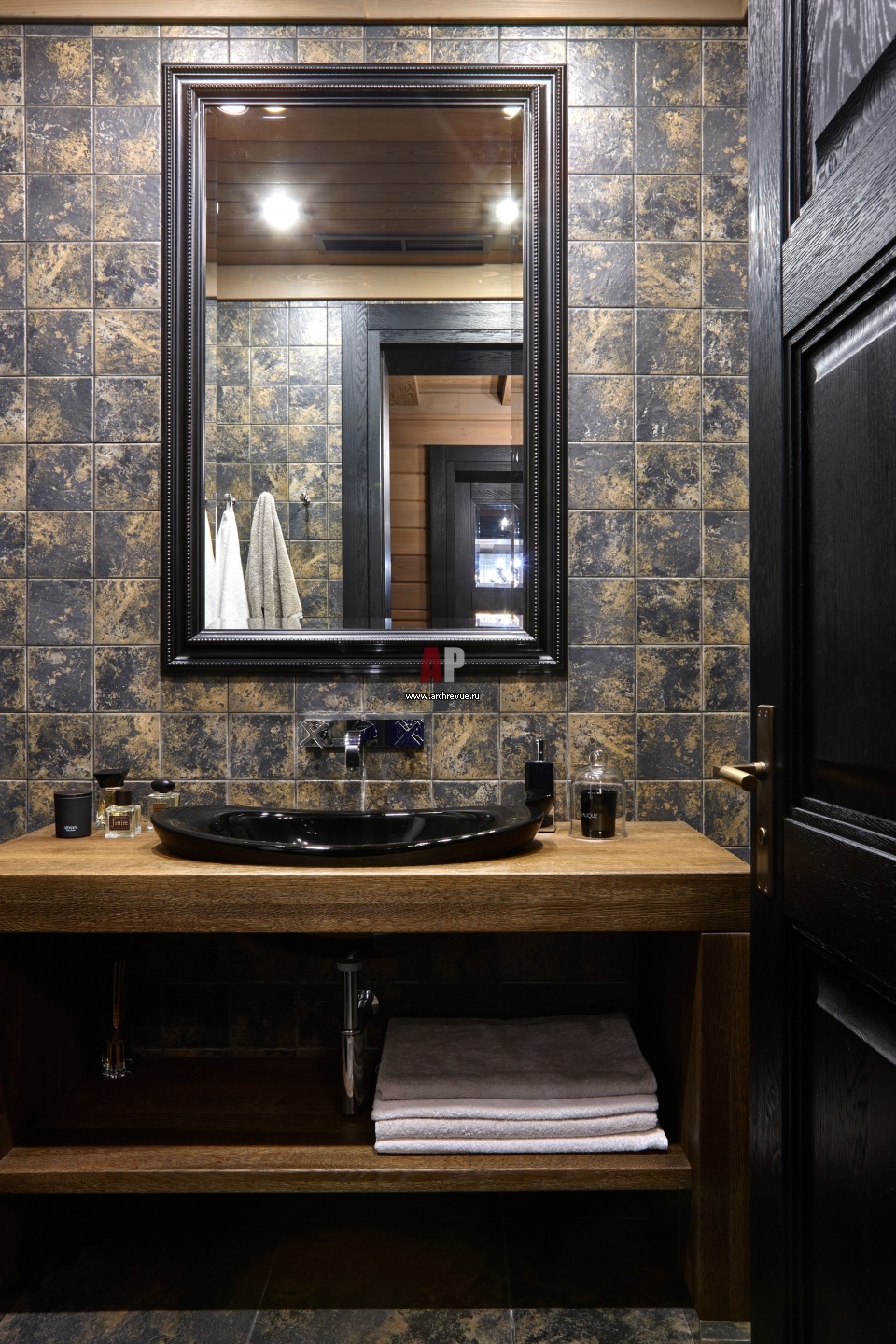 Санузел при бассейне выдержан в темных тонах. Сантехника, Villeroy & Boch, Keramag, Duravit, Hansgrohe, Axor.