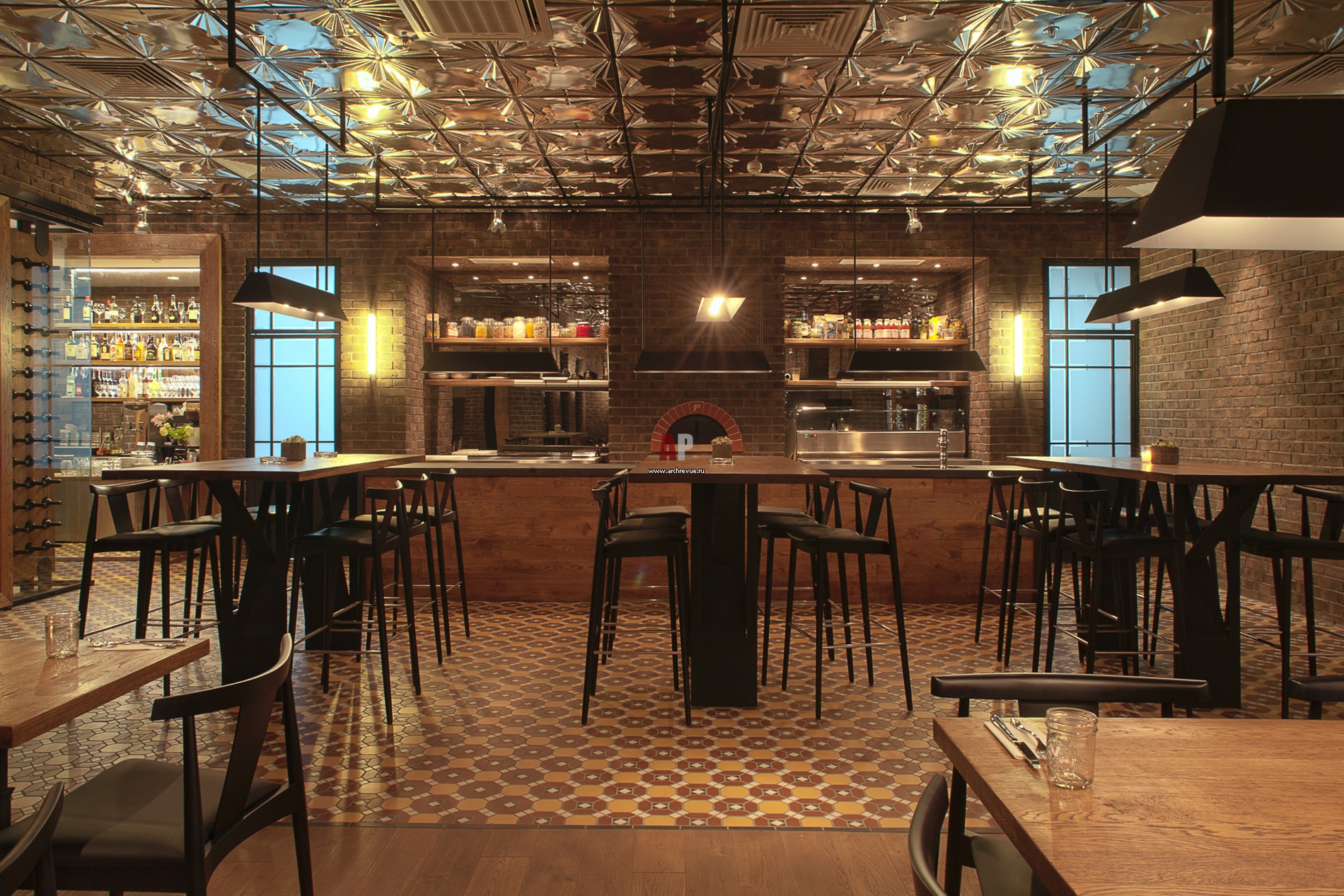 Бар и открытая кухня – две визуальные доминанты интерьера. Для привлечения внимания они дополнительно акцентированы светом.