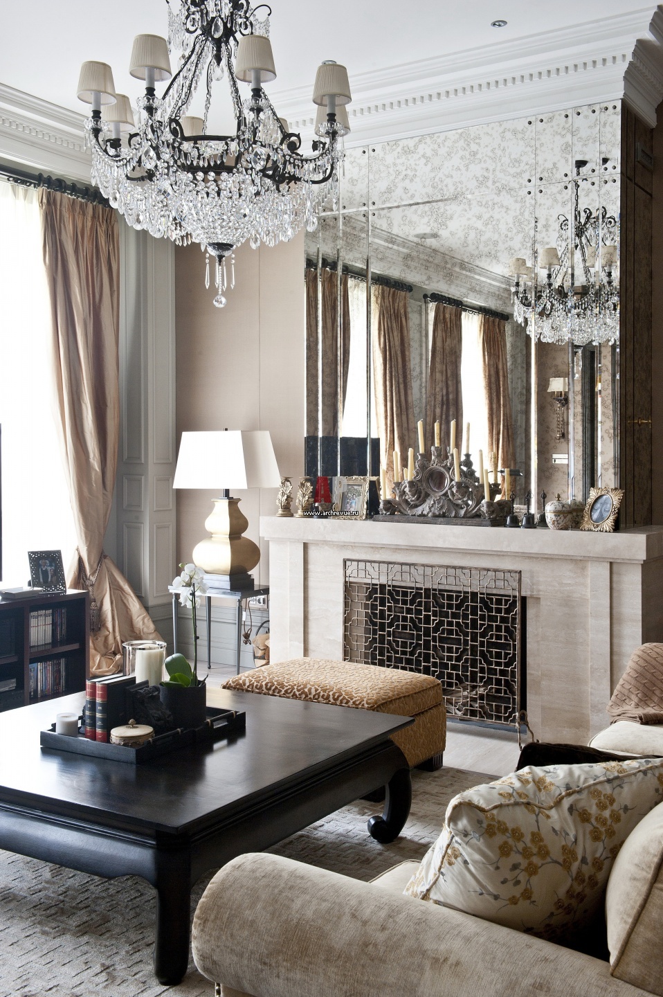 Портал камина выполнен из травертина, дымоход облицован состаренными зеркалами, орнамент декоративного экрана выполнен в китайском стиле. Люстра, Fine Art Lamps. Настольная лампа, Visual Comfort & Co.