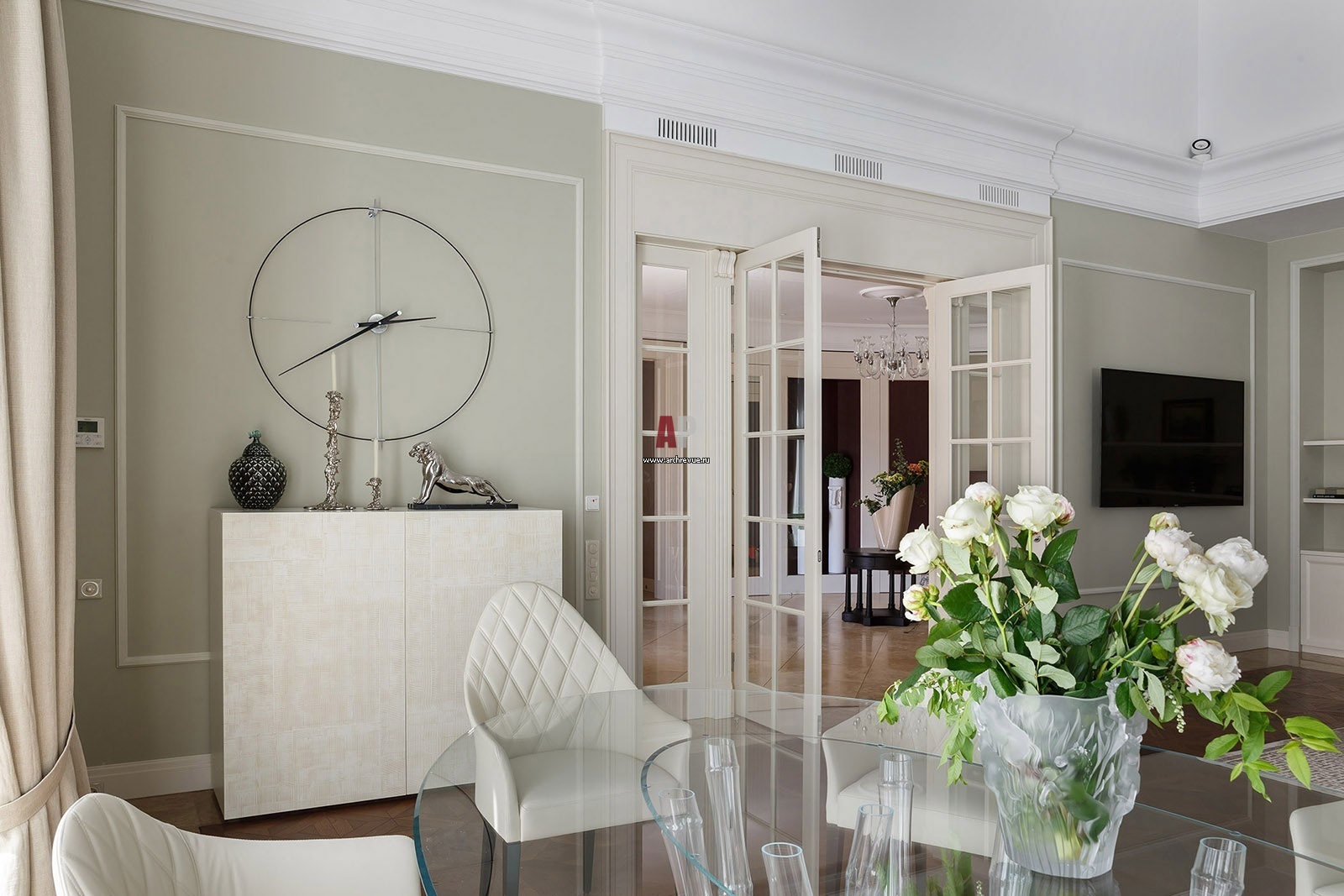 Вид из гостиной-столовой на входной холл. Камень сменяется в жилых комнатах дубовым паркетом, однако по периметру остается каменный кант. Тумба под часами Casamilano. Часы, Nomon.