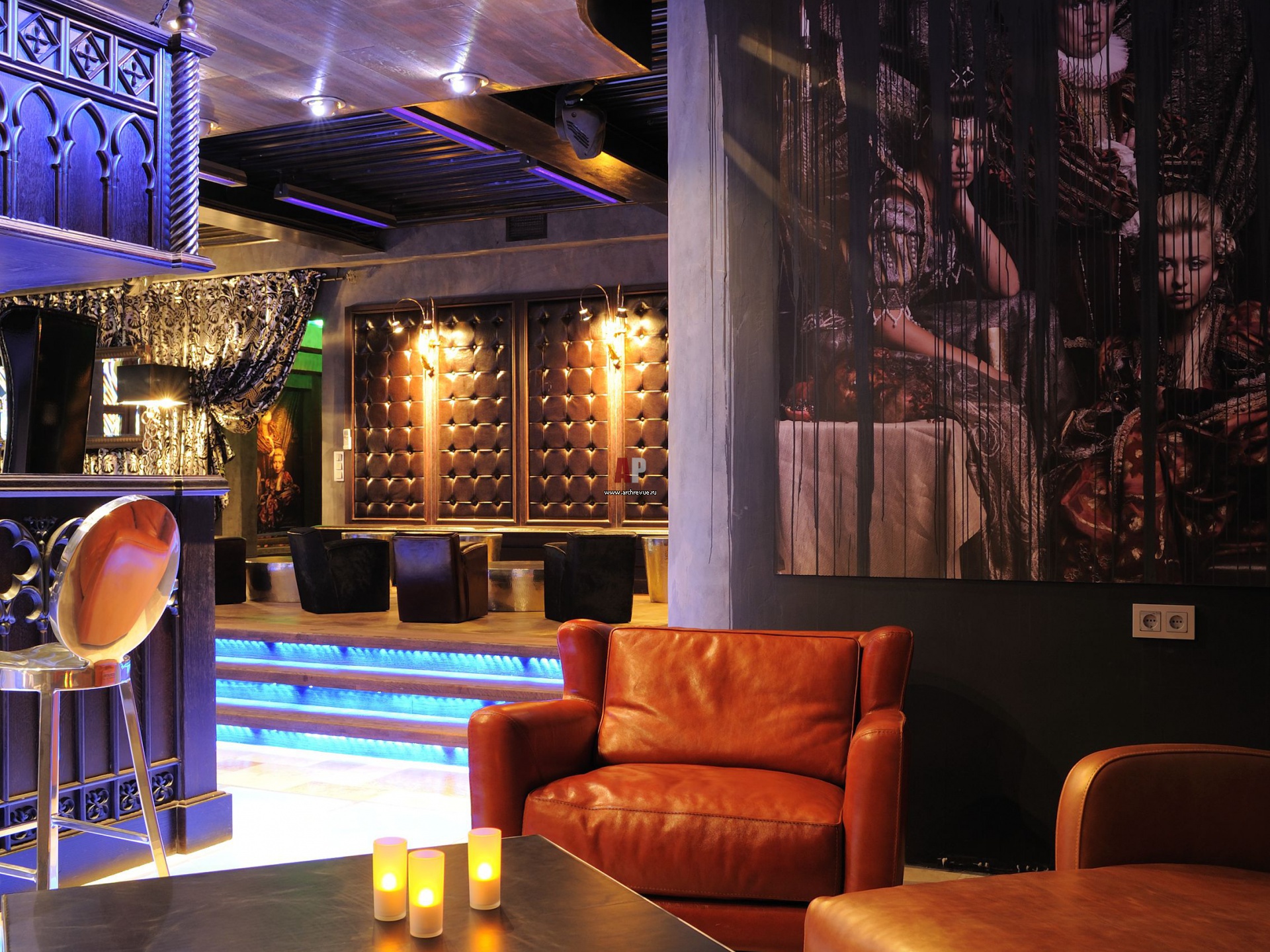 Респектабельную обстановку создает кожаная мебель Baxter. Стены оформлены фотоработами Ольги Фоминой. Стена на дальнем плане сделана из кожи, декорированной каретной стяжкой, изготовление Beni.