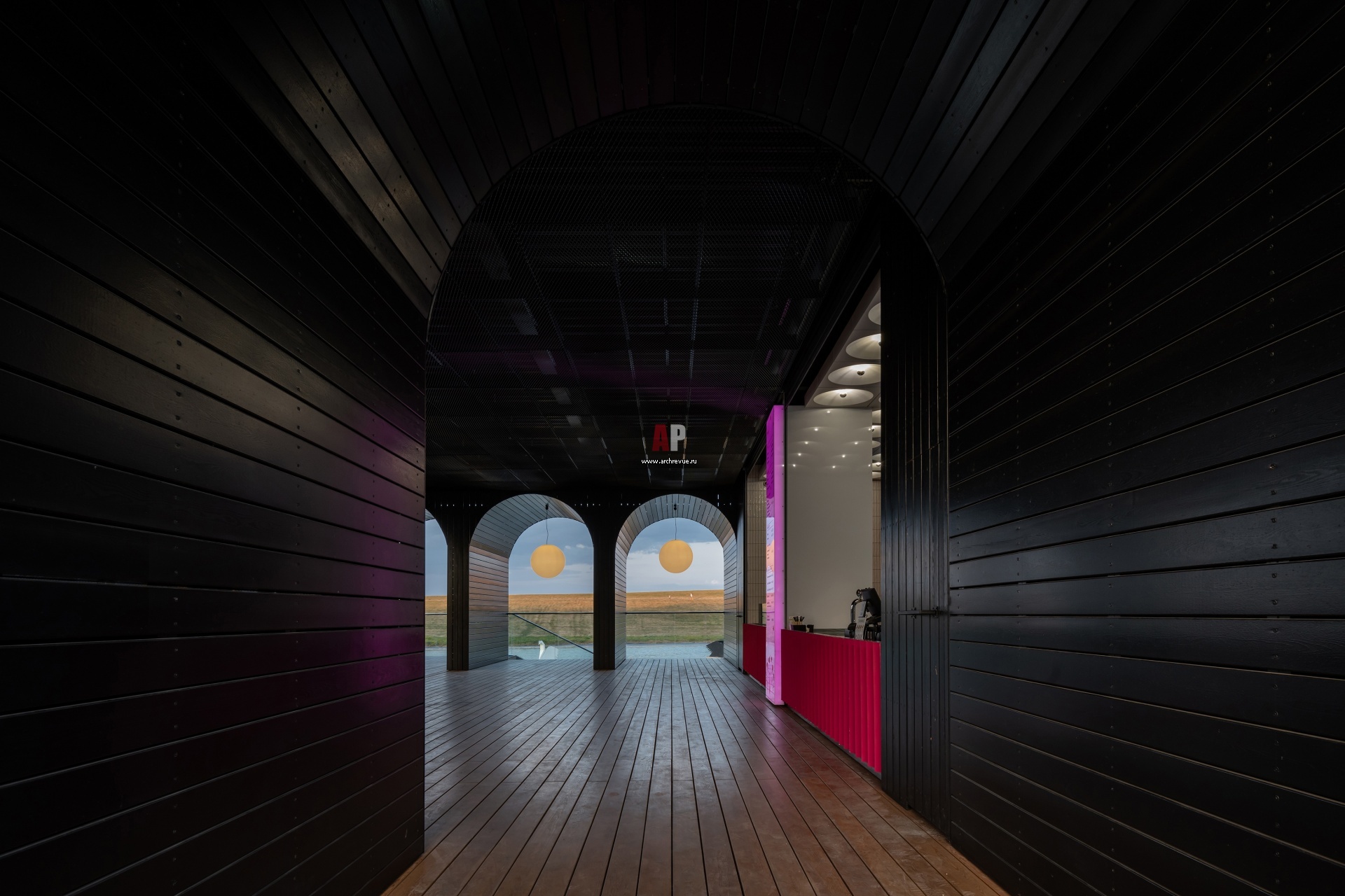 На террасе к темному дереву добавляется подсветка цвета фуксии.