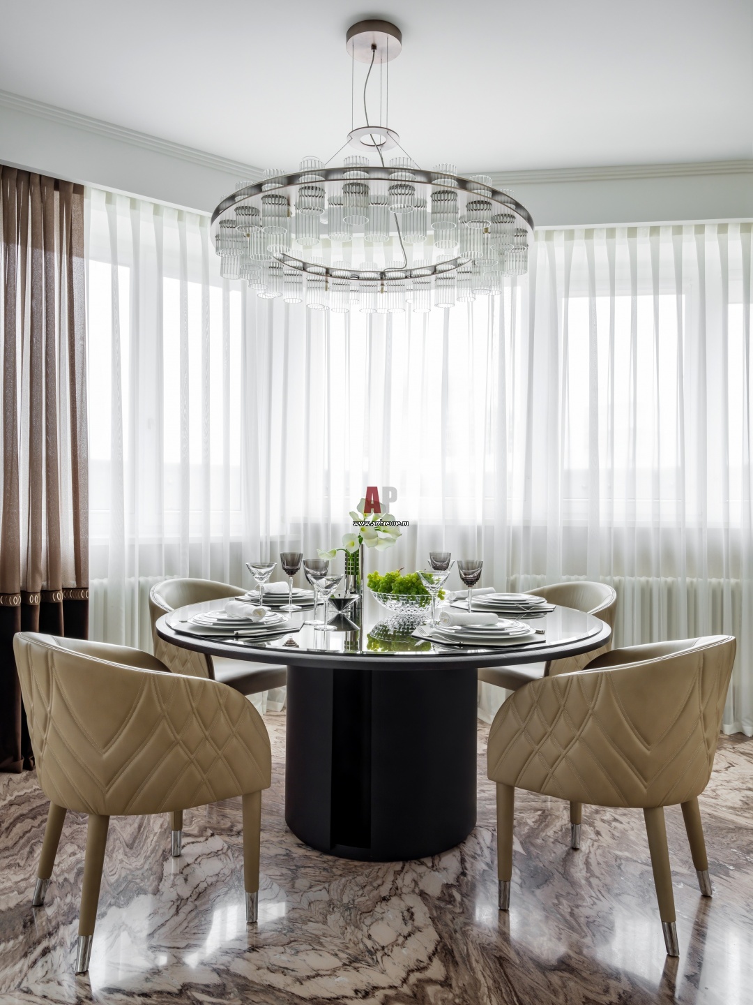 Зона столовой. Стол, стулья, люстра, Smania.