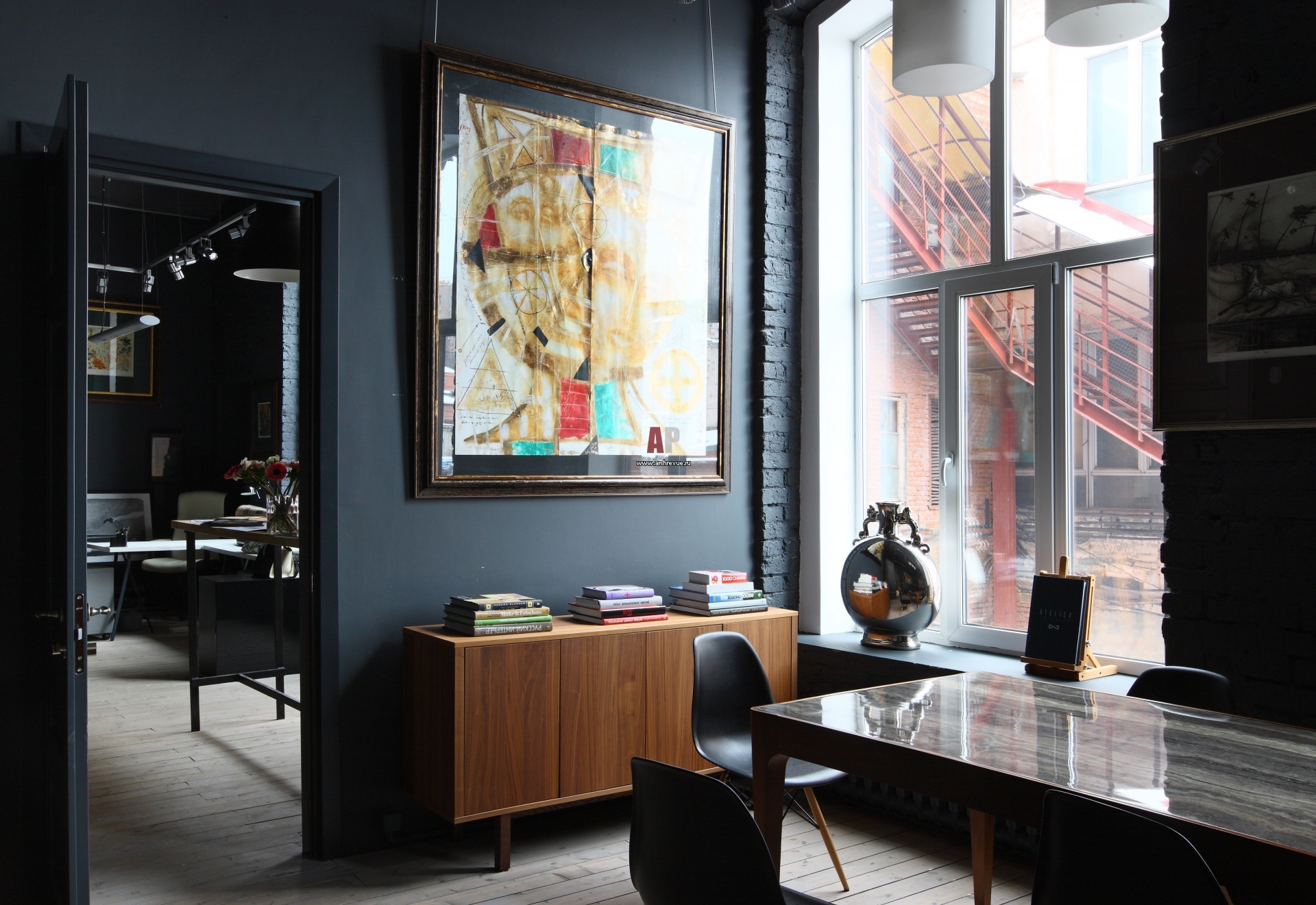 Кабинет-переговорная объединены с рабочей зоной дверным проемом. Архитекторы постарались подчеркнуть архитектурные особенности здания, отказавшись от штор и жалюзи на арочных окнах.
