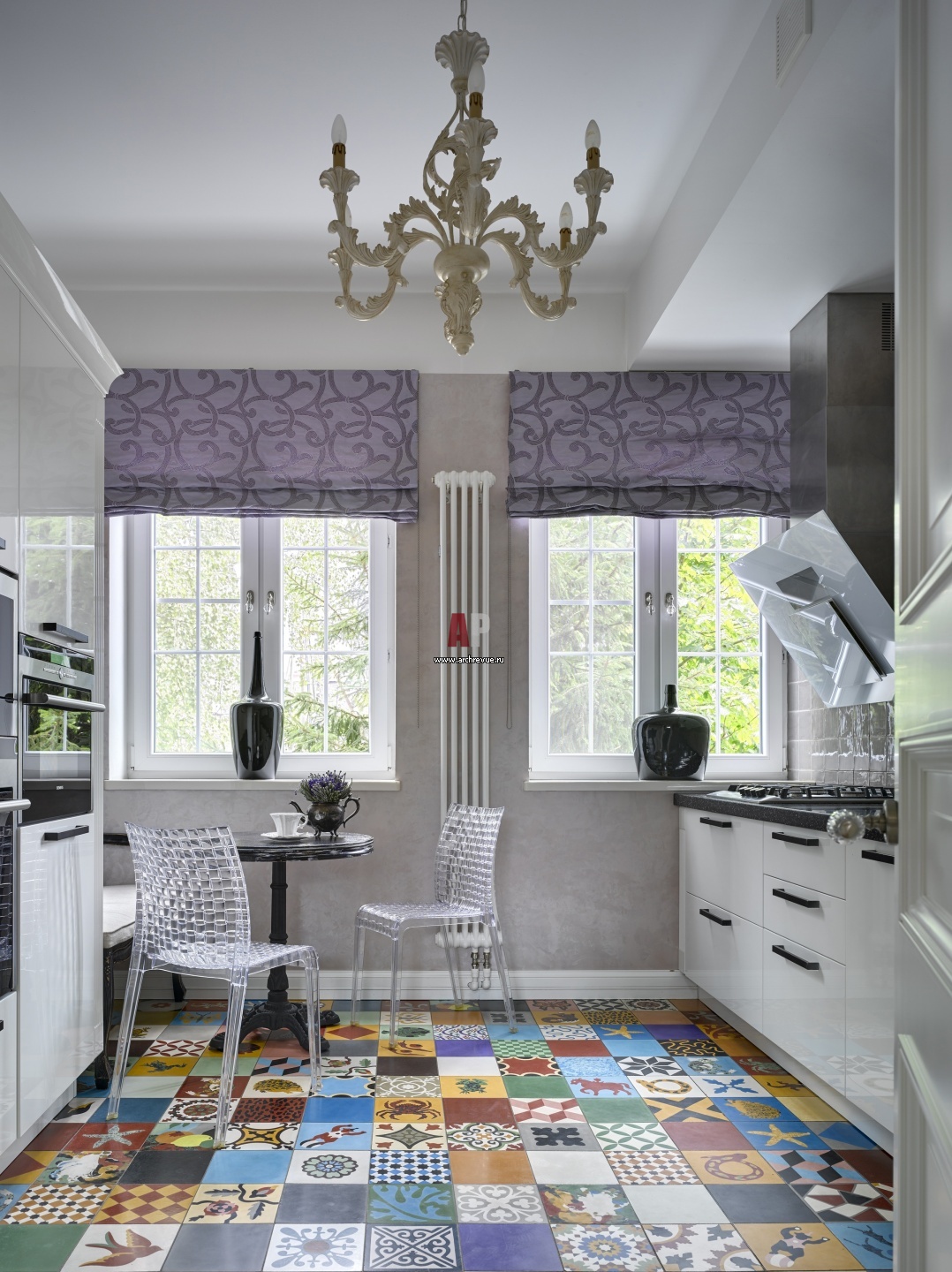 Самое яркое помещение в доме – изолированная кухня. Ее пол выложен керамической плиткой со средиземноморским орнаментом. Плитка, Carocim, серия Martin Murat Animals. Кухонный гарнитур решен в белом цвете.