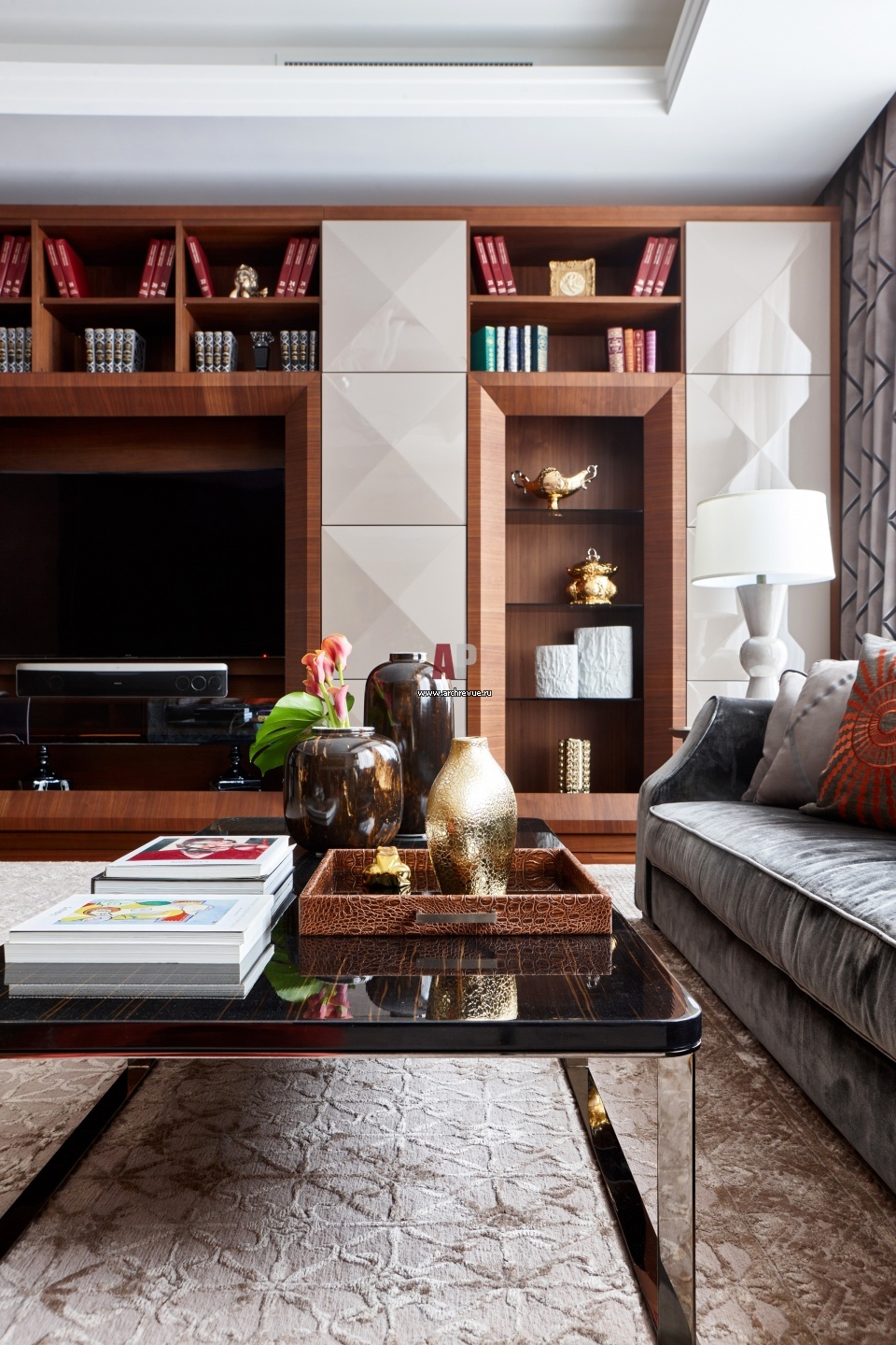 Композиция ТВ-стеллажа сделана на заказ в итальянской мастерской. Настольные лампы, вазы, поднос на журнальном столе, Crate and Barrel.