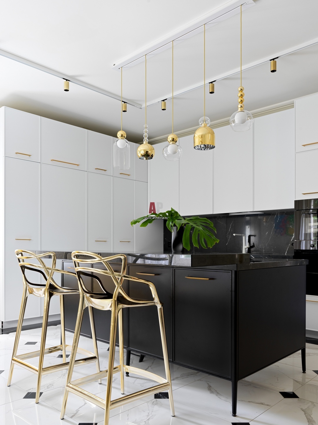 Белая кухня с черным островом. Барные стулья, Kartell. Благодаря варочной панели со встроенной вытяжкой дизайнеру удалось разместить над островом красивые светильники Evi Style по дизайну Димы Логинова вместо громоздкой вытяжки.