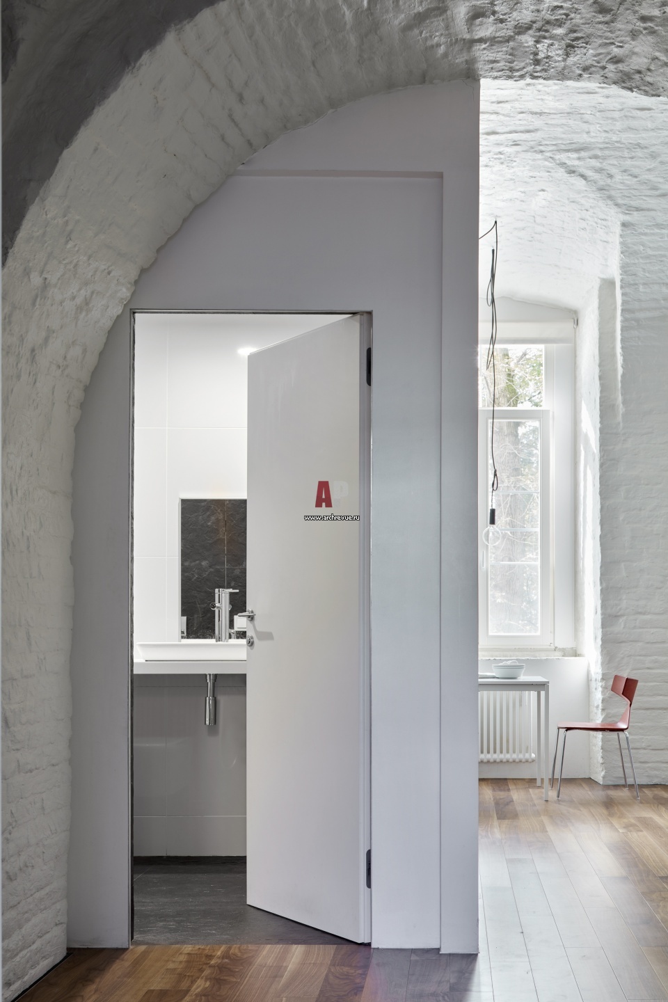 Санузел вынесен в отдельный бокс – кубический объем, выстроенный из гипсокартона. Высокие безрамные двери белого цвета, Le Porte di Barausse.