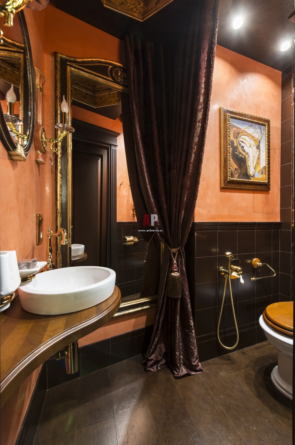 Одно из самых эффектных помещений в квартире – гостевой санузел. Стены в нем оформлены декоративной штукатуркой насыщенного терракотового цвета и керамической плиткой оттенка горячего шоколада. Пол выложен покрытием из натуральной кожи. Вертикальное зеркало обрамлено патинированным лепным декором из коллекции Orac Decor, поставщик «Ампир Декор». Сантехника, LineaTre, Globa. Портьеры, Rubelli.