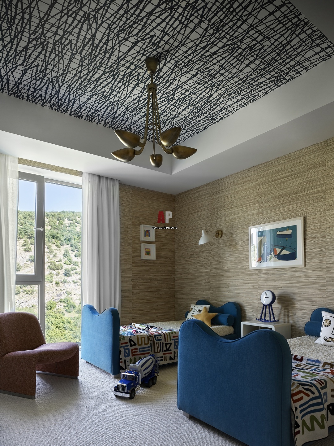 Спальня мальчиков. Поток оклеен обоями, Thibaut. Люстра, Arteriors. Бра, Circa Lighting. Кровати, на заказ – изготовление «Мастерская Елены Гусевой». Кресло Alky chair by Giancarlo Piretti for Castelli, 1970-е годы.