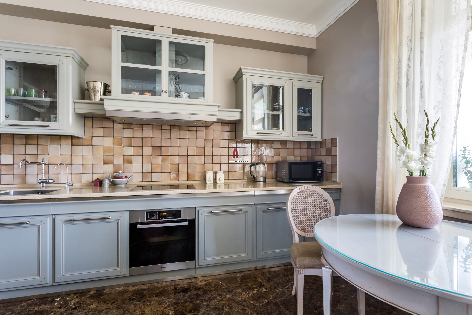 Интерьер кухни в стиле неоклассика. Кухонный гарнитур L'Ottocento выполнен в двух цветах: нежном серо-голубом и слоновая кость. Кухонный фартук облицован плиткой BASSET Ets, 10x10, CHAMPAGNE ручной работы. Плитка, поставщик «Грета Вульф».