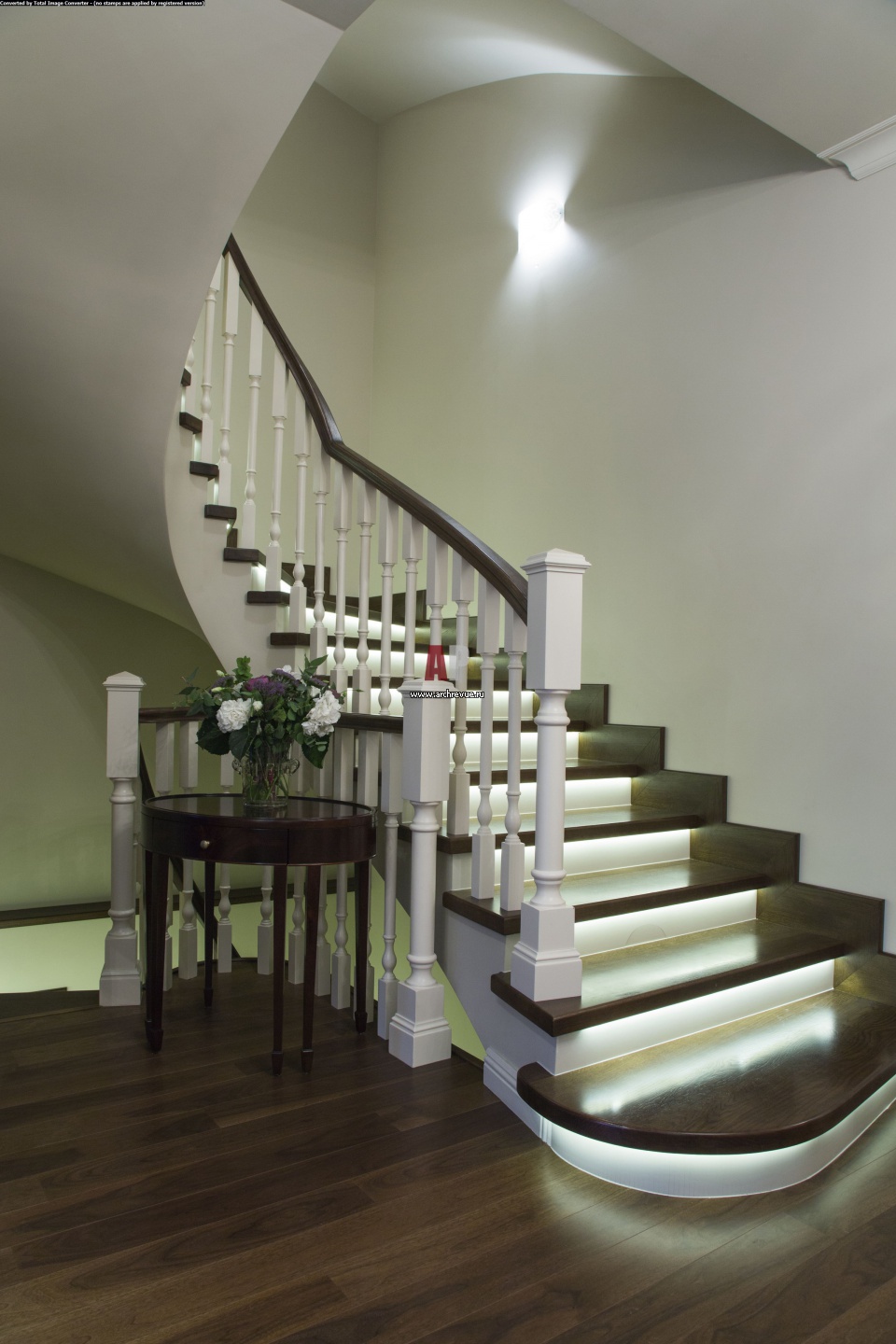 Четыре уровня таунхауса связывает примыкающая к стене лестница из дерева. Ерила и ступени выполнены из дуба темного цвета, балясины и подступенки выкрашены белой эмалью. Ступени лестницы подсвечены.