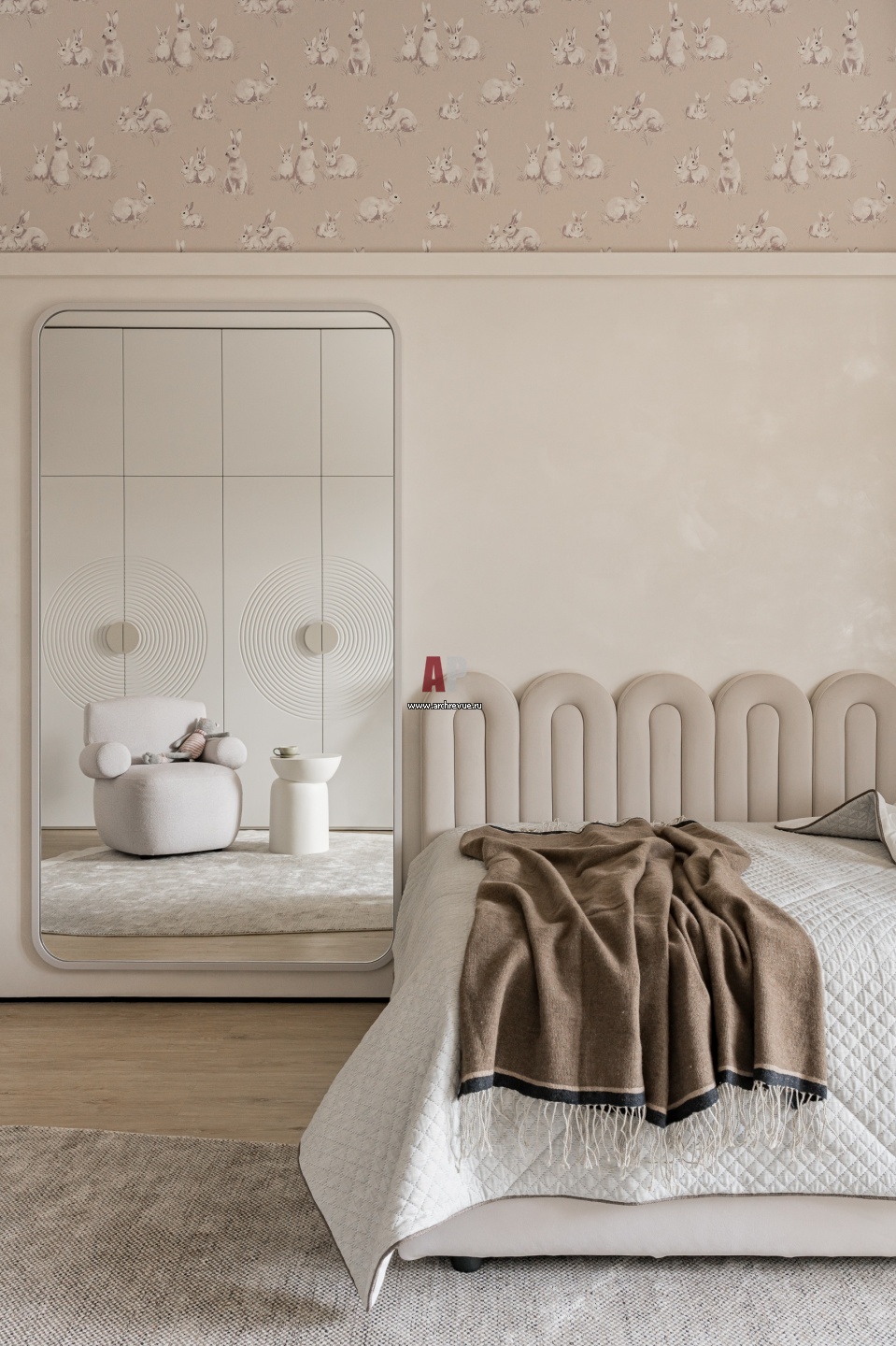 В детской комнате много деталей округлых форм: потолочные светильники, элементы декора фасадов встроенных шкафов, тканевые панели за кроватью. Это придают интерьеру мягкий и уютный вид.