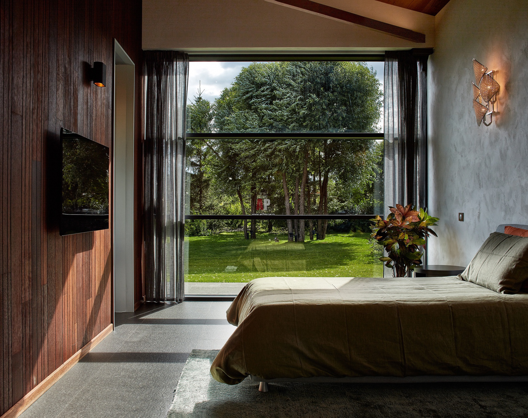 Интерьер спальни с панорамными окнами. Кровать, Flou.
