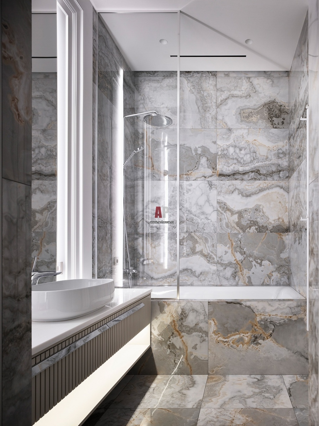 Детский санузел оформлен керамогранитом с активным рисунком, La Faenza, коллекция Oro Ocean Blue. Запотолочная подсветка над ванной и за зеркалом у раковины отлично заменяет традиционный верхний свет. Ванна, Bette. Смесители, Hansgrohe.