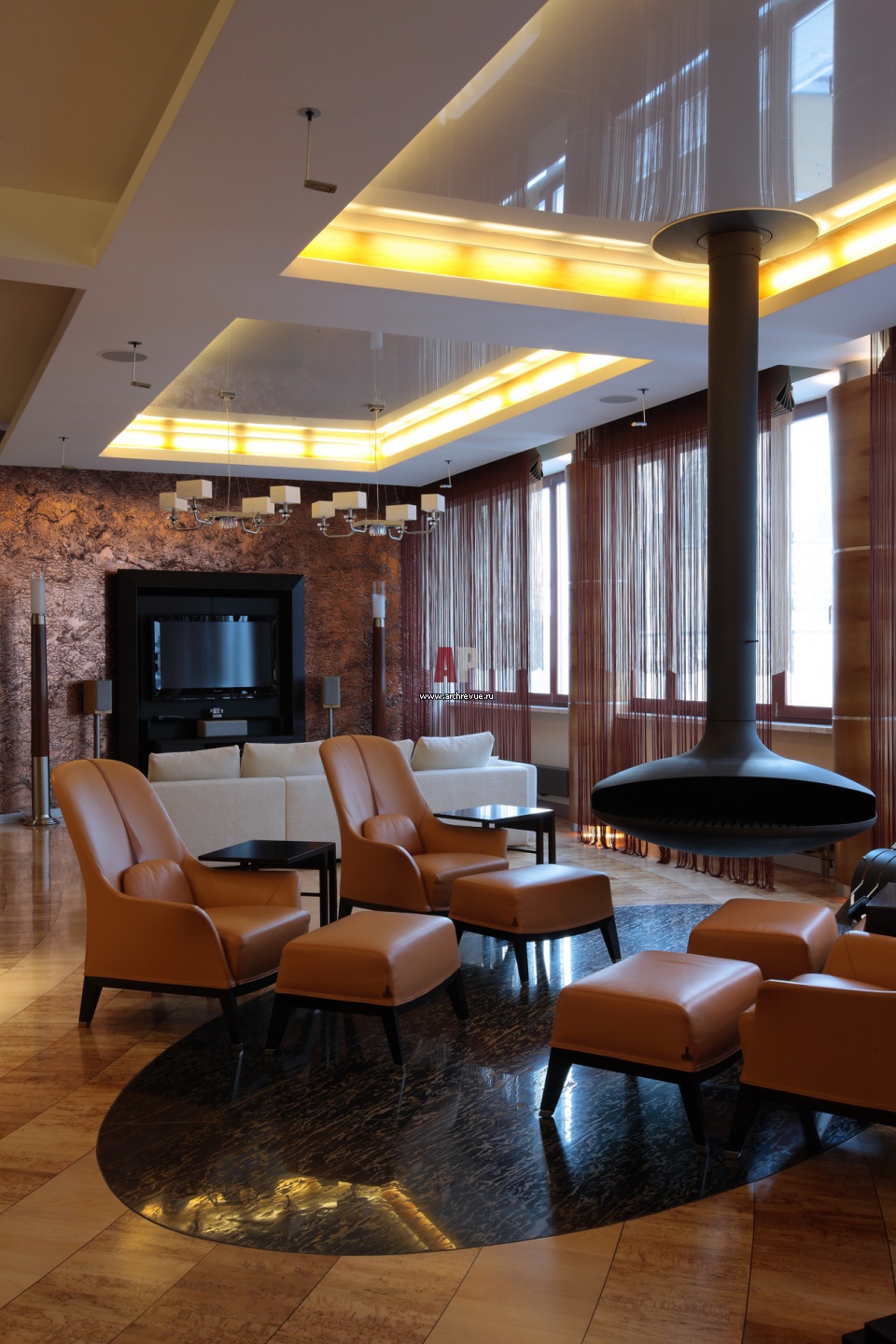 Вид со стороны камина на зону домашнего кинотеатра. Стена за ТВ оформлена декоративными штукатурками с эффектом ржавого металла. «Ячеистая» конструкция потолка – элемент зонирования 100-метрового помещения.