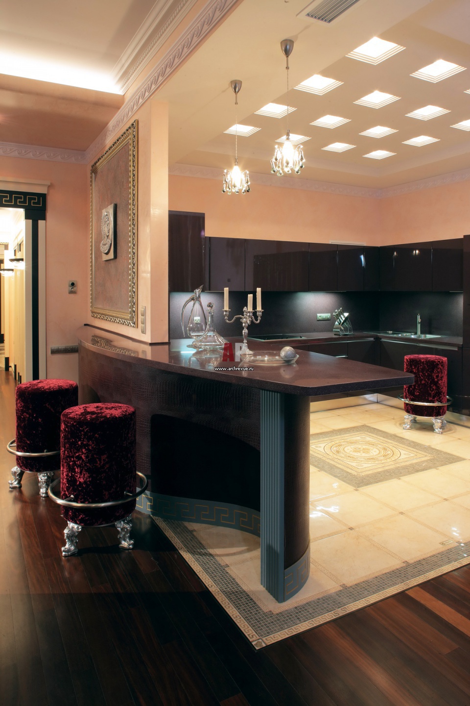 Кухня решена на контрасте темных лакированных закрытых фасадов гарнитура от Snaidero и светлой напольной плитки по дизайну Versace. Кессонные потолки из гипса.