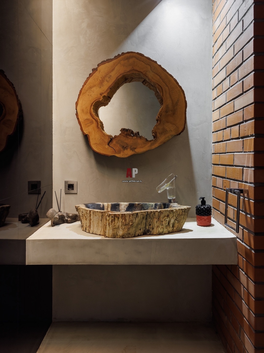Гостевой санузел на первом этаже. В нем установлена раковина из окаменелого дерева, которому более 150 миллионов лет. В отделке использованы микробетон и выложенная единым полотном глянцевая черная плитка, Porcelanosa. Смеситель, Axor, модель Starck V.