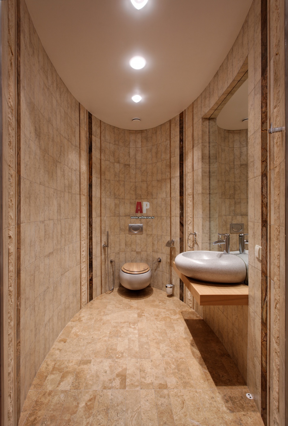 Гостевой санузел расположен внутри эллиптического объема. Его особенности – овальная форма и сантехника, имитирующая натуральный камень.