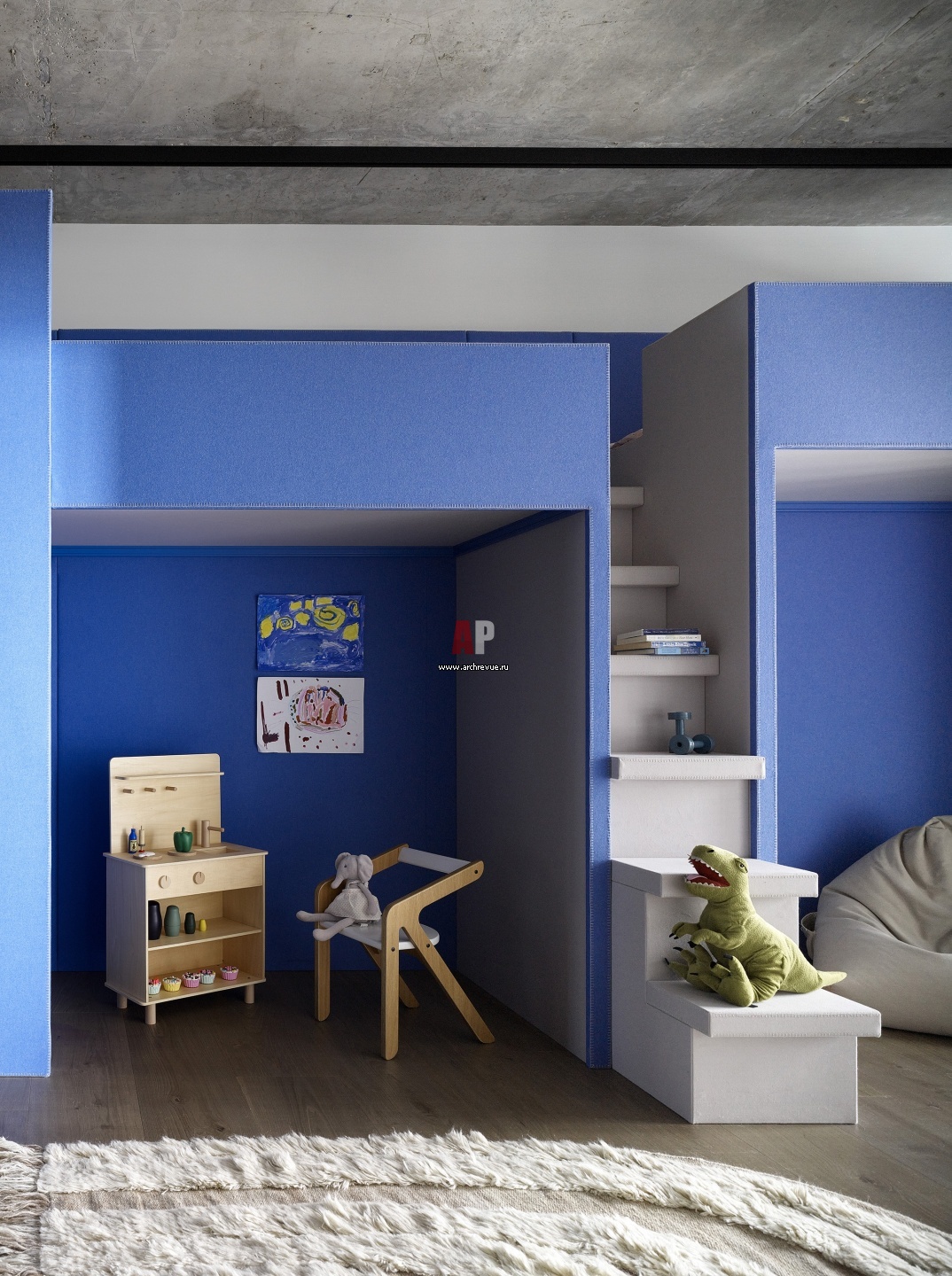 Акцентный цвет детской комнаты – насыщенный синий. Детская игровая мебель, Moonk Design.