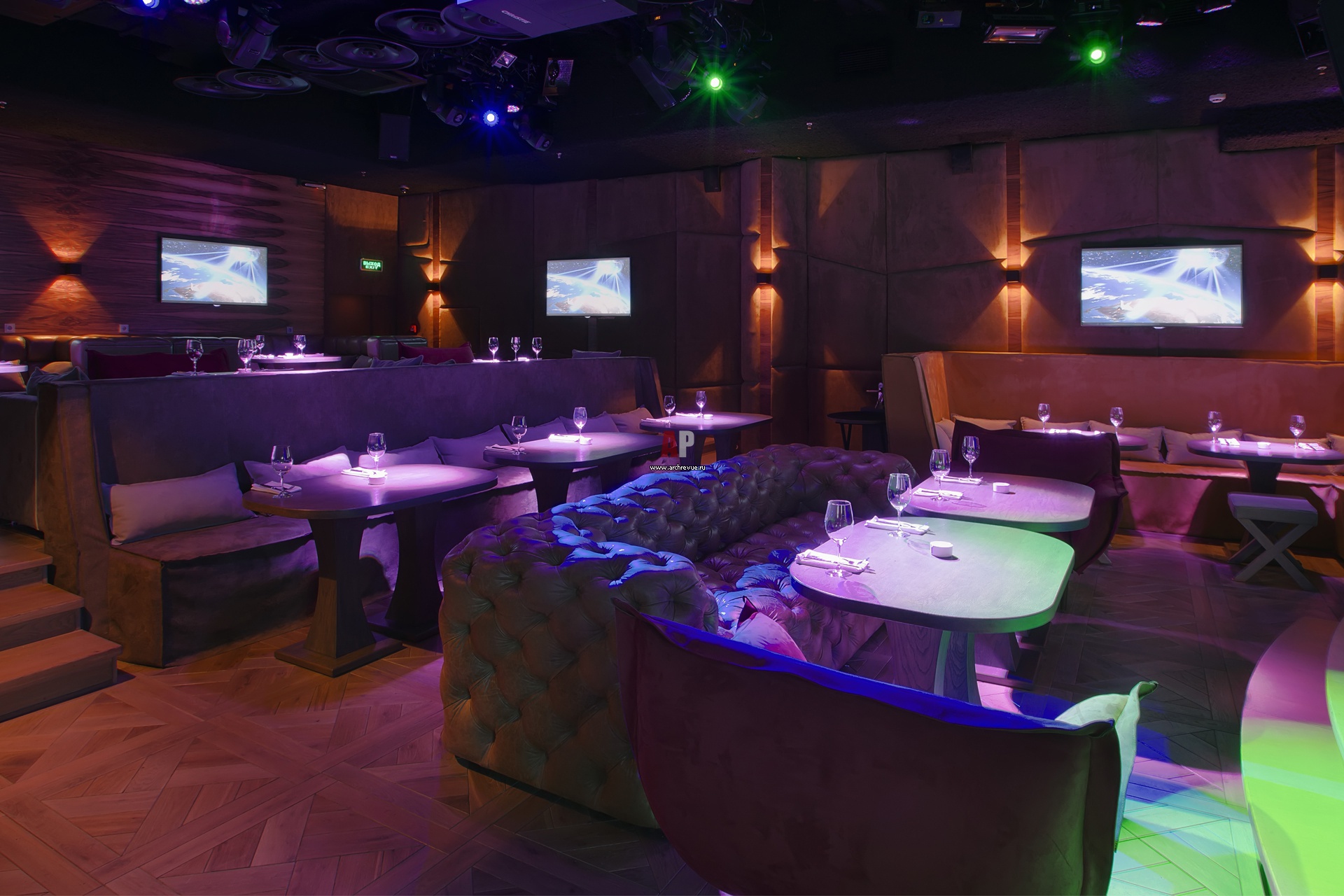На полу караоке--бара – щитовой паркет из дуба. Подобный укладывают в жилых интерьерах, в ресторане он создает камерное настроение.