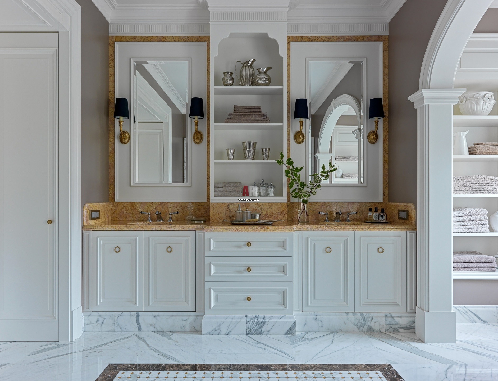 Хозяйская ванная комната оформлена в светлой палитре. Тумба под парные умывальники сделана на заказ. Столешница выполнена из мрамора красивого теплого цвета.