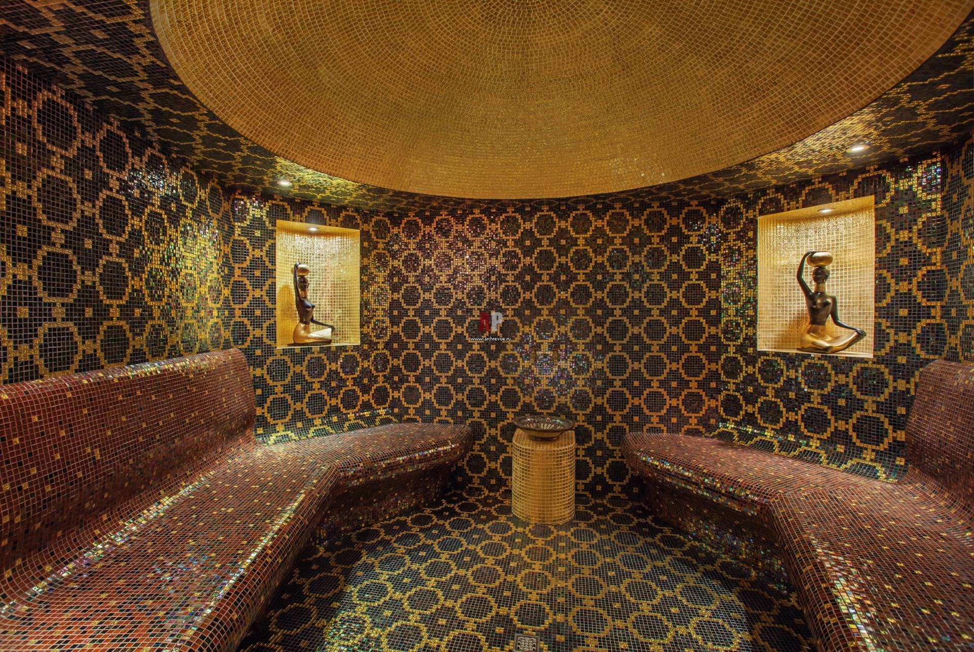 Хаммам облицован черно-золотистой смальтовой мозаикой. В золотых нишах – антикварные статуэтки – женские фигуры из черной бронзы с позолотой.