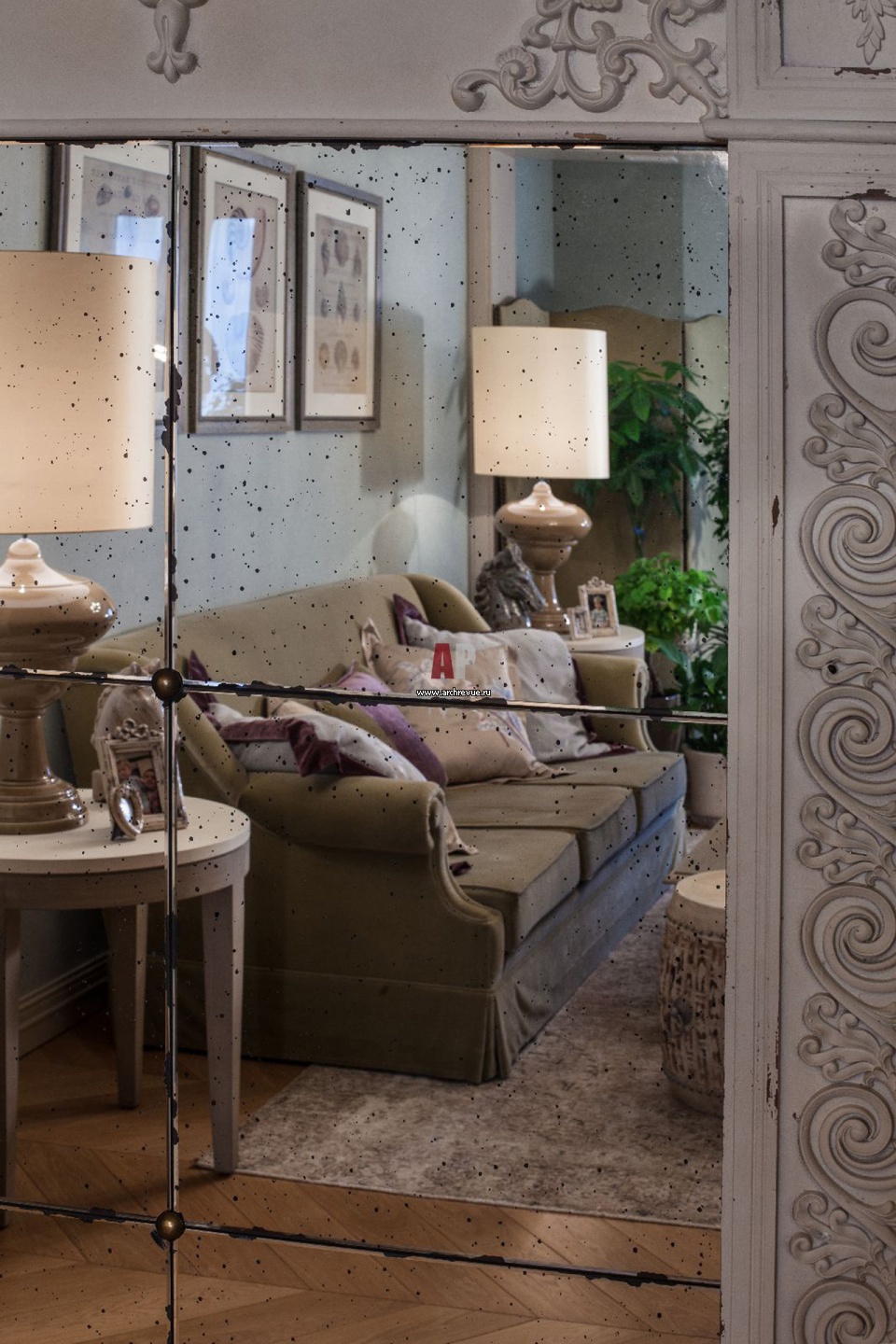 Фото интерьера гостиной в зеркальном отражении.