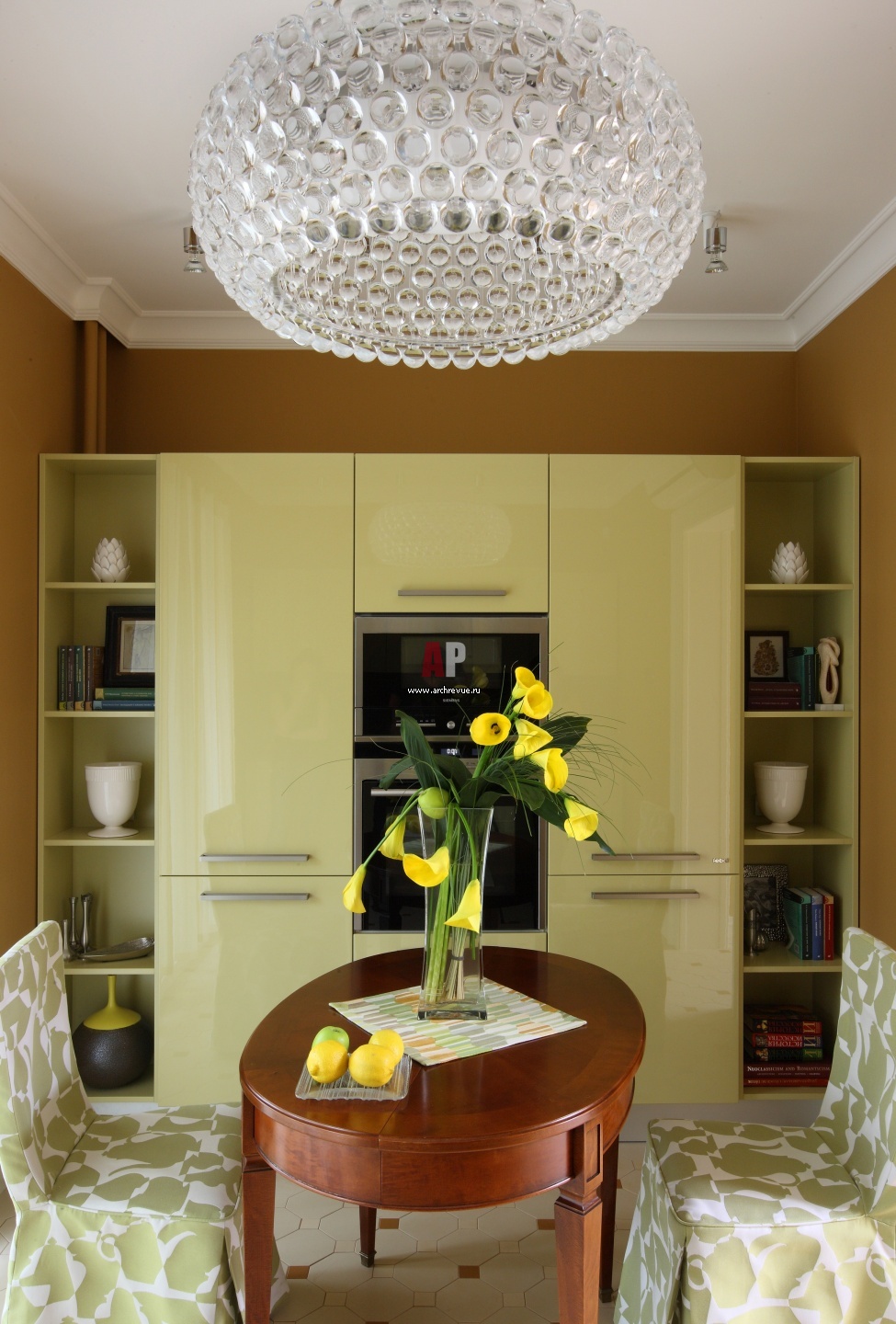 Особенность домов для советской элиты – изолированная, но маленькая кухня. Готовить в ней не предполагалось, советский человек был избавлен от быта. Чтобы создать функциональное помещение, дизайнер разнесла кухонную мебель по двум стенам: с одной стороны разместилась зона для приготовления пищи и мойка, с другой – вся встроенная бытовая техника, включая два больших холодильника. Ощущение воздуха удалось добиться за счет отказа от угловой кухни, заменив ее фронтальными композициями.