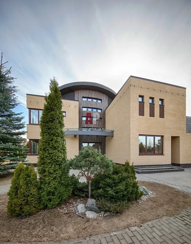 Кирпичный двухэтажный дом построен в 2000-х годах, его фасад имеет форму волны. Архитектор изменила входную группу, сделав парадный вход с панорамным остеклением и витражной входной дверью. Открытое фасадное решение полностью оправданно: дом находится в глубине участка, вдали от посторонних глаз.