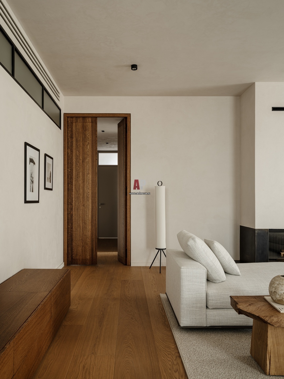 Стены и потолки помещений покрыты фактурной минеральной штукатуркой, скрывающей мелкие дефекты и удобной в эксплуатации. На полу – широкая деревянная доска.