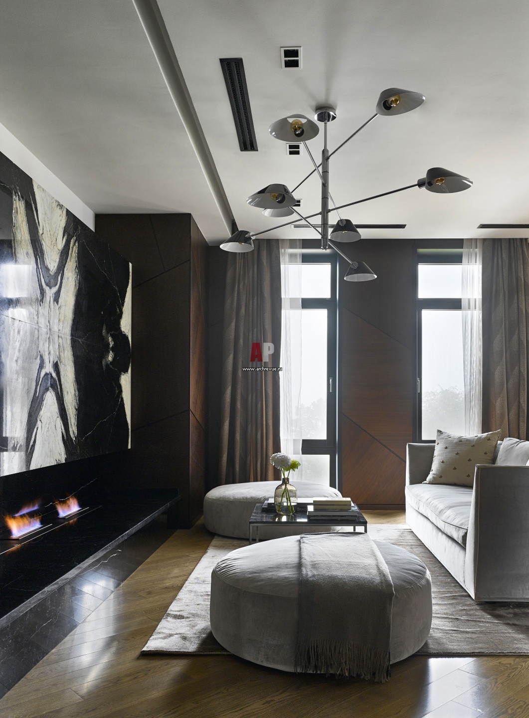 Современный семейный дом в горах. Зона отдыха в мастер-спальне. Простенки между окнами зашиты темными панелями из ореха. Слева – биокамин, перед ним – группа из мягких круглых пуфов. Диван, пуфы, столики, Frigerio. Люстра, Aromas del Campo.
