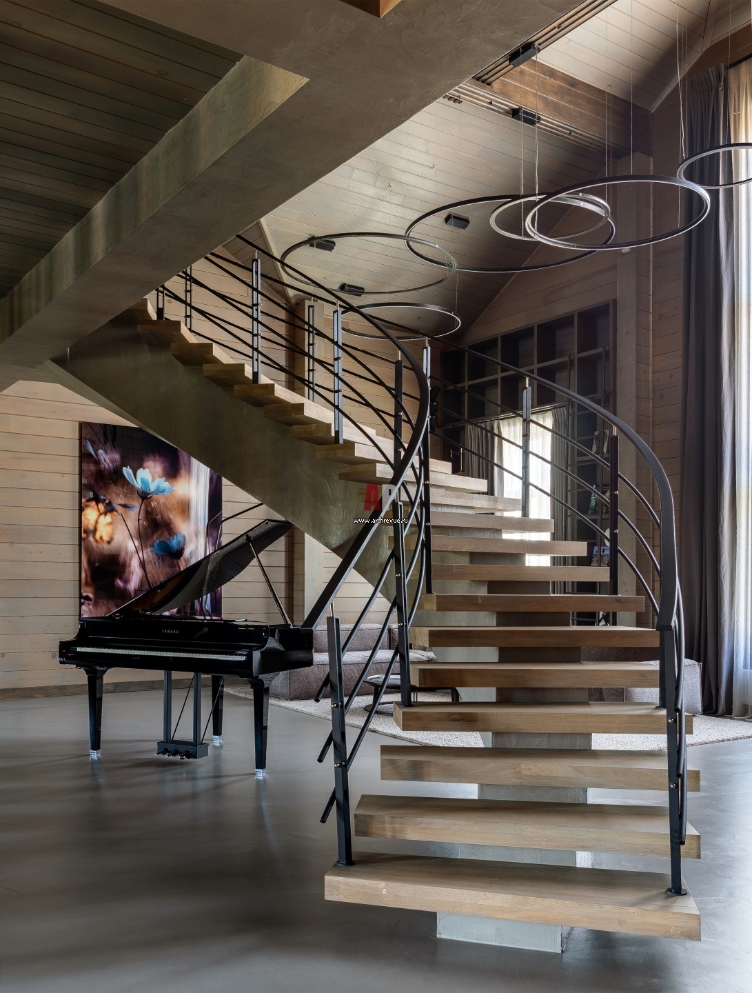 Доминанта первого этажа – винтовая лестница с бетонным косоуром. За ней расположен рояль. Люстры–кольца выполнены по специальным размерам, Jacco Maris, модель Framed.
