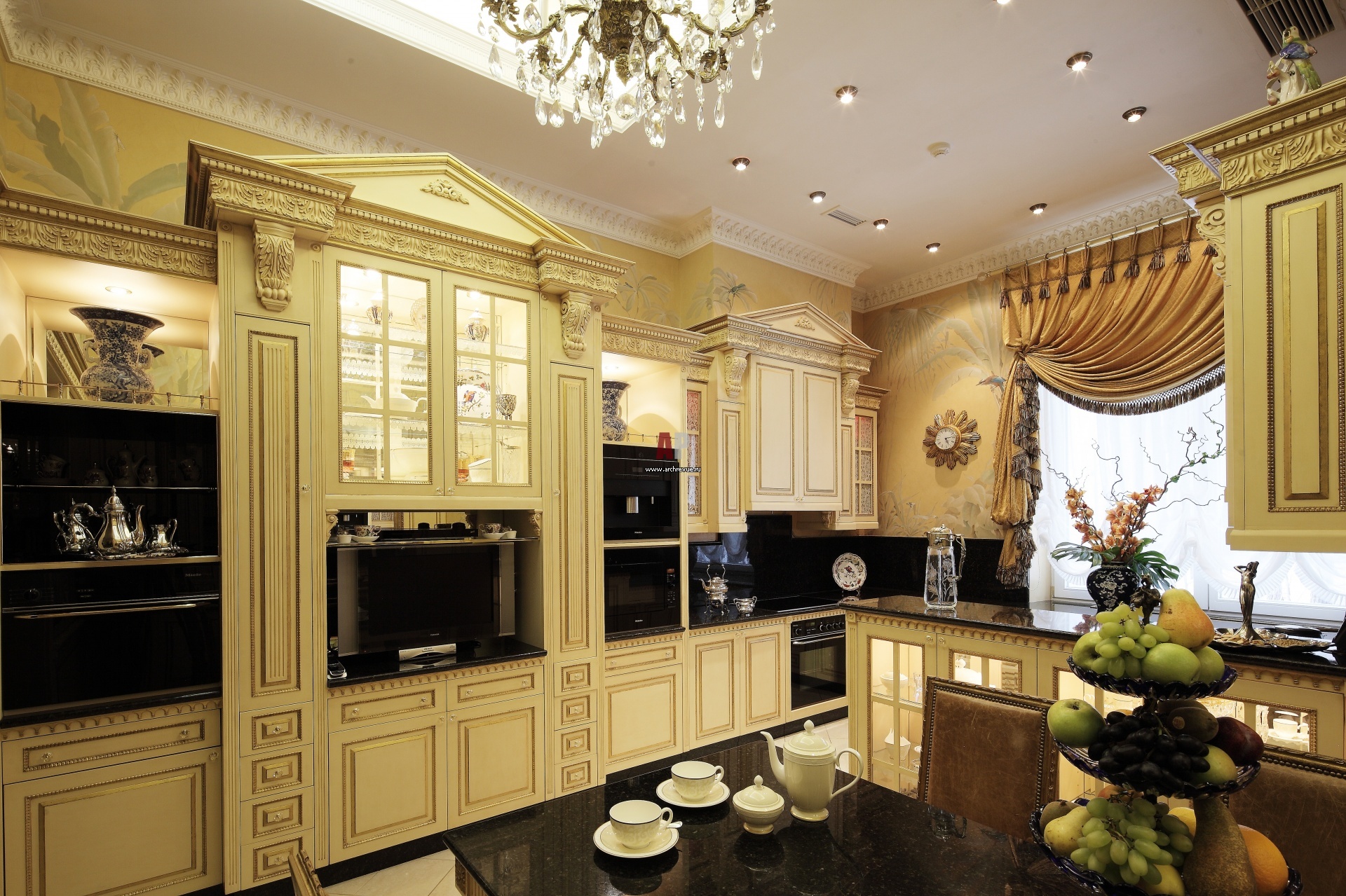 Интерьер кухни выполнен в классическом стиле. Кухонный гарнитур с резными пилястрами и декоративными порталами выполнен по эскизам архитектора на английской фабрике. Со светлыми фасадами кухни контрастирует темный мрамор столешниц.