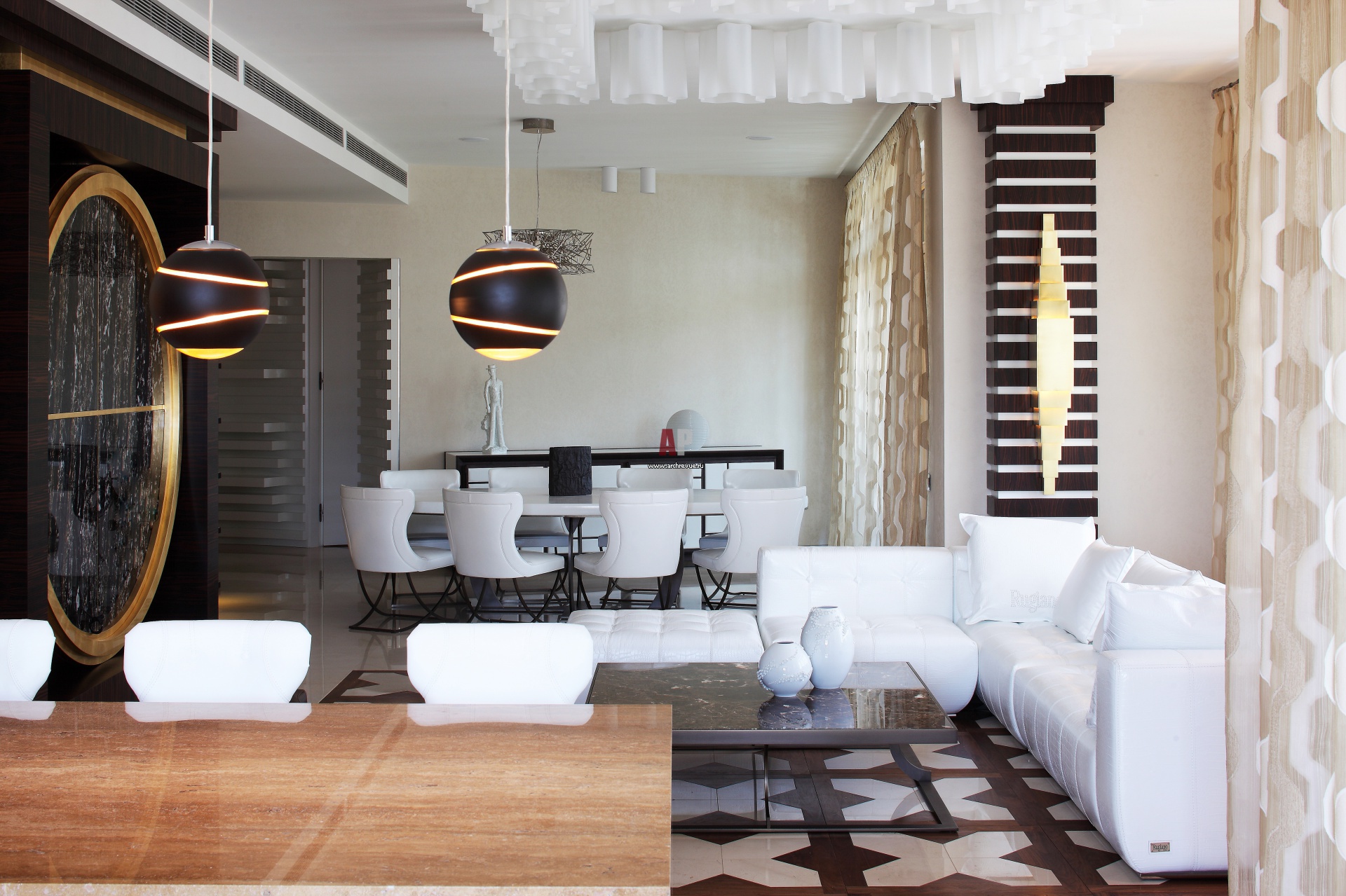 Фото интерьера зоны столовой в гостиной. Белая кожаная мебель придает жилому интерьеру парадный вид. Декоративная перегородка -экран из макасара и темного мрамора, изготовление «АФ Ника».
