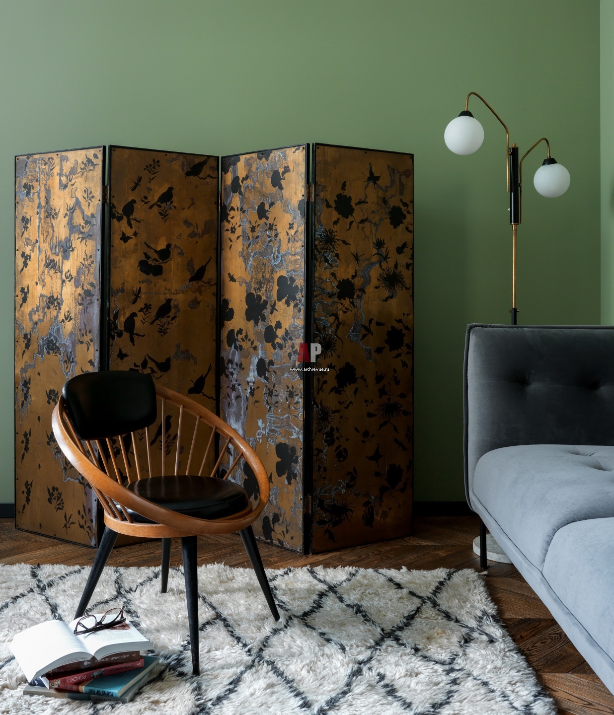 Дизайнерская квартира для галеристки. Авторская ширма, художник Екатерина Рожкова. Кресло, дизайнер Ингве Экстрём, Швеция, 1960г.