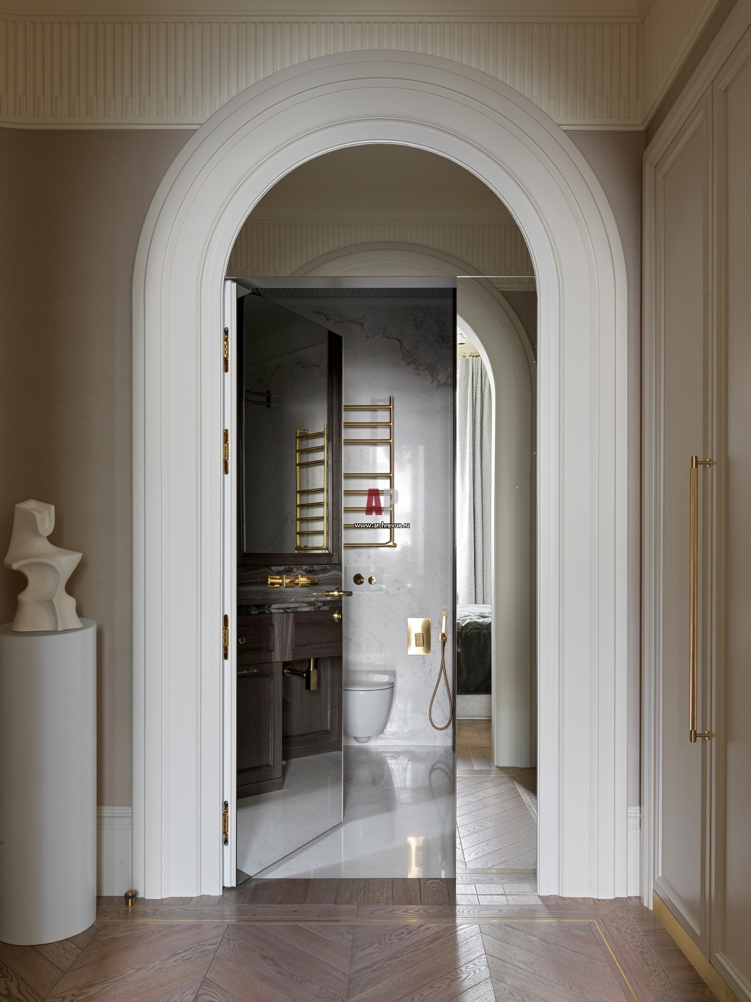 Вход в ванную обрамляет зеркальная стена со скрытой дверью. Скульптура, керамика, Константин Покидов.