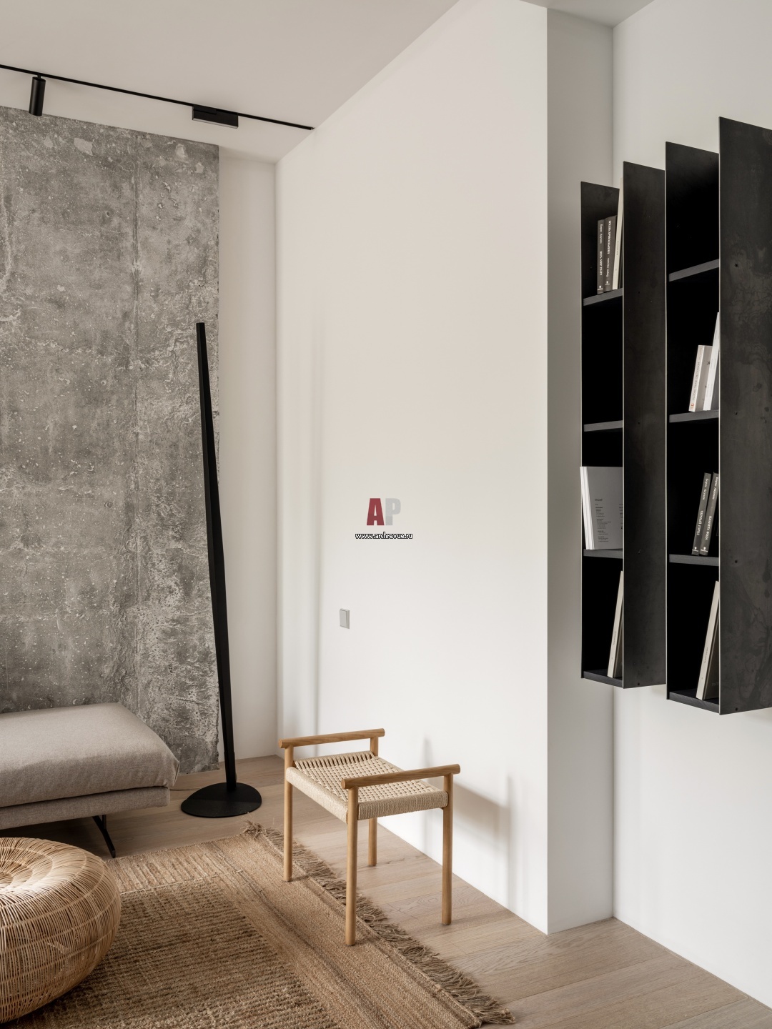 Интерьер гостиной. Полки из горячекатанной стали и фанеры сделан на заказ.