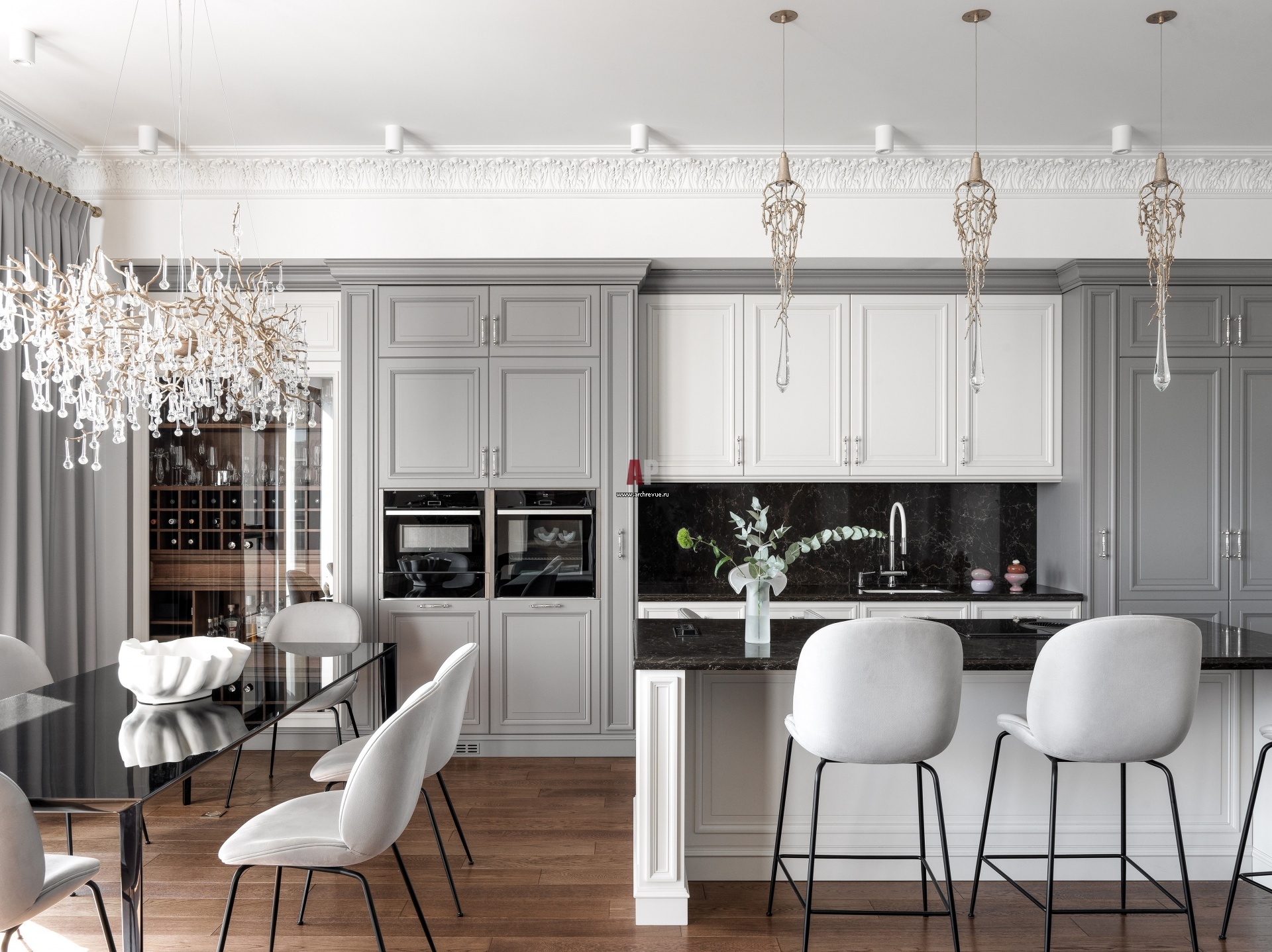 Кухонный гарнитур с лаконичными неоклассическими фасадами и островом, FM Bottega, модеоль London. Столешницы изготовлены из контрастного черного мрамора. Барные стулья, Gubi, модель Beetle Dining Chair. Светильники над кухонным островом, Serip, модель Liquid.